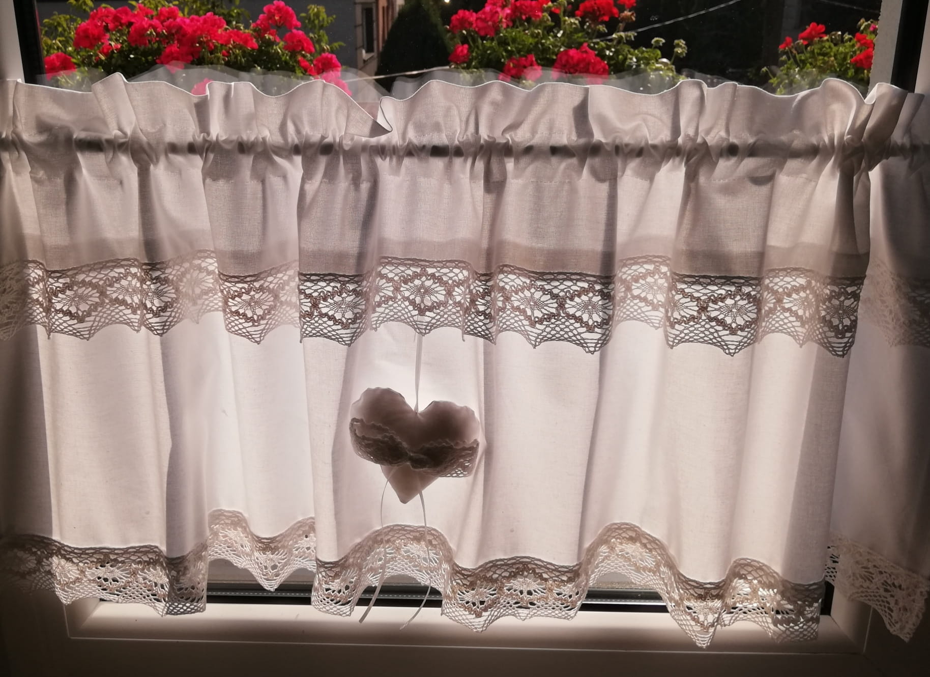 Zazdrostka uszyta z polskiej bawełny z dodatkiem bawełnianej koronki. Na zazdrostkę przypada 1 zawieszka z serduszkiem. Pięknie prezentuje się w romantycznym i nowoczesnym wnętrzu.