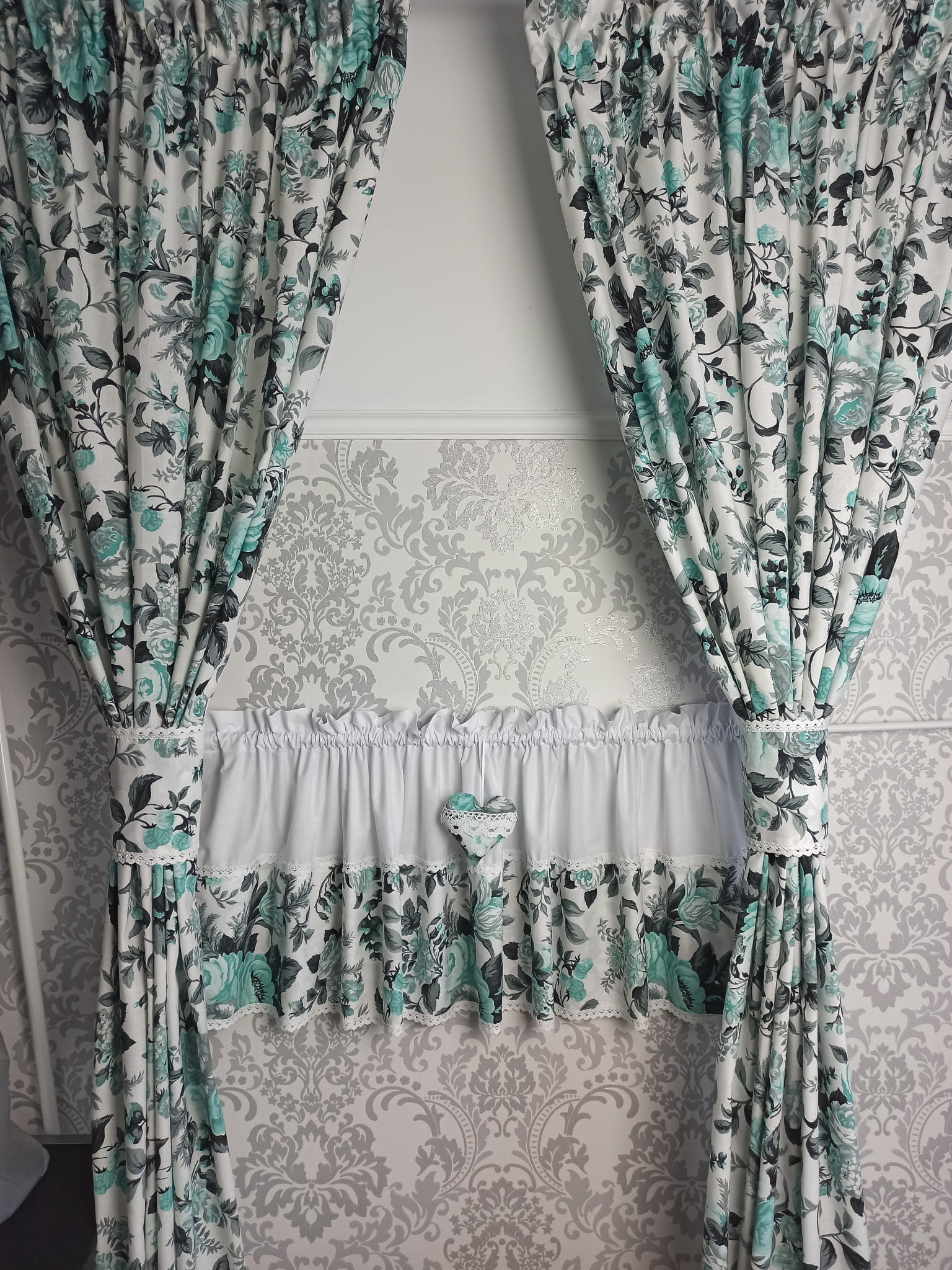 Oferuję uroczy komplet zasłon do kuchni w piękne, miętowe róże.