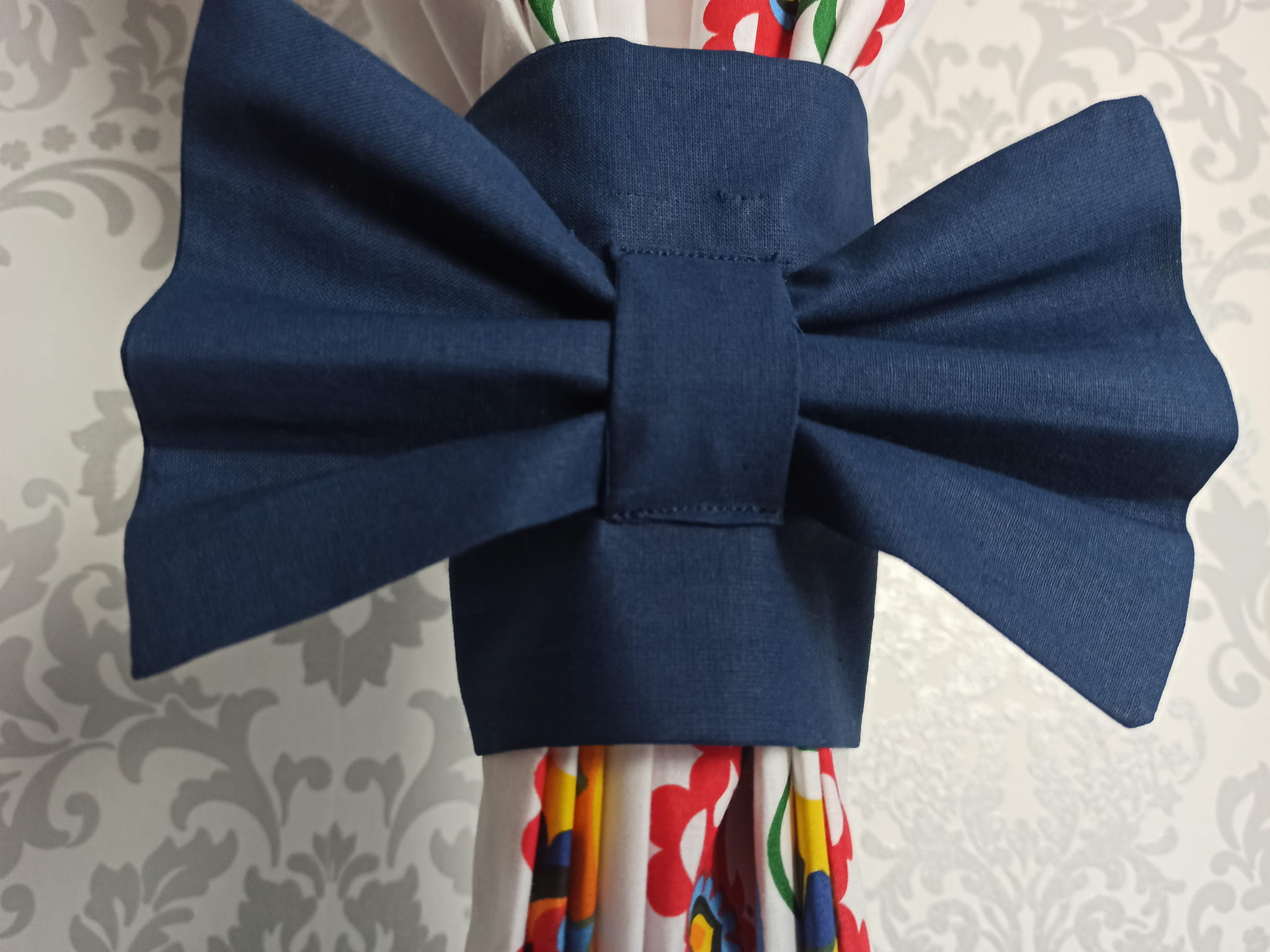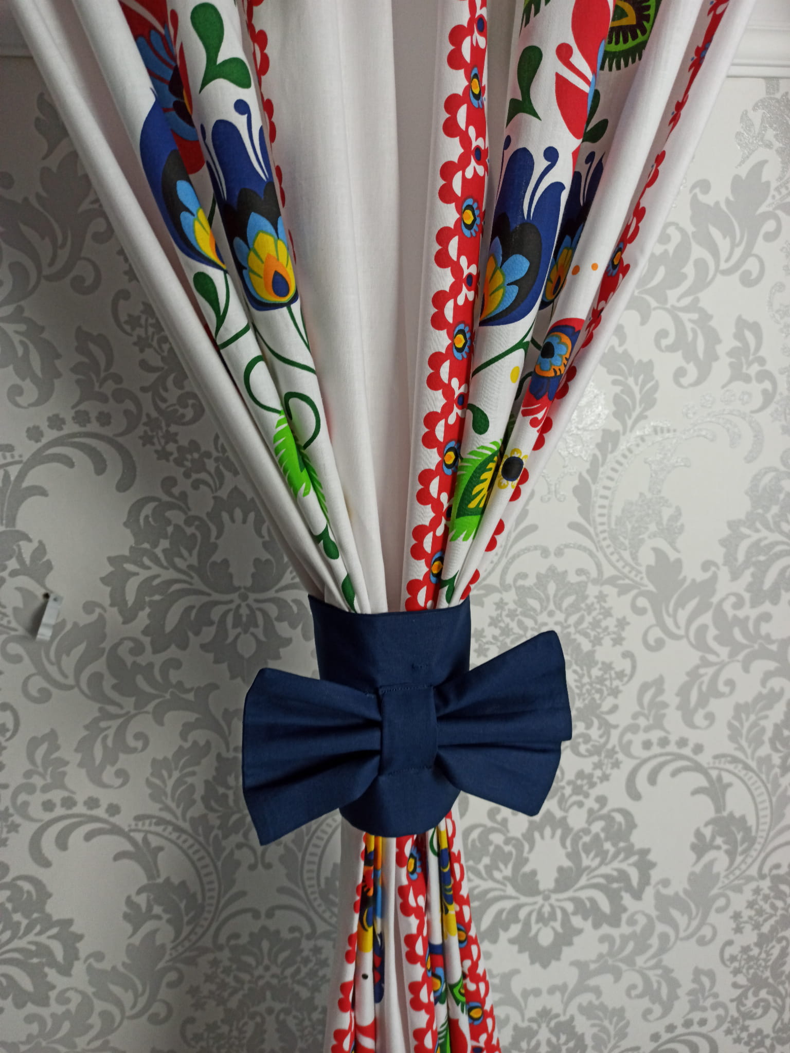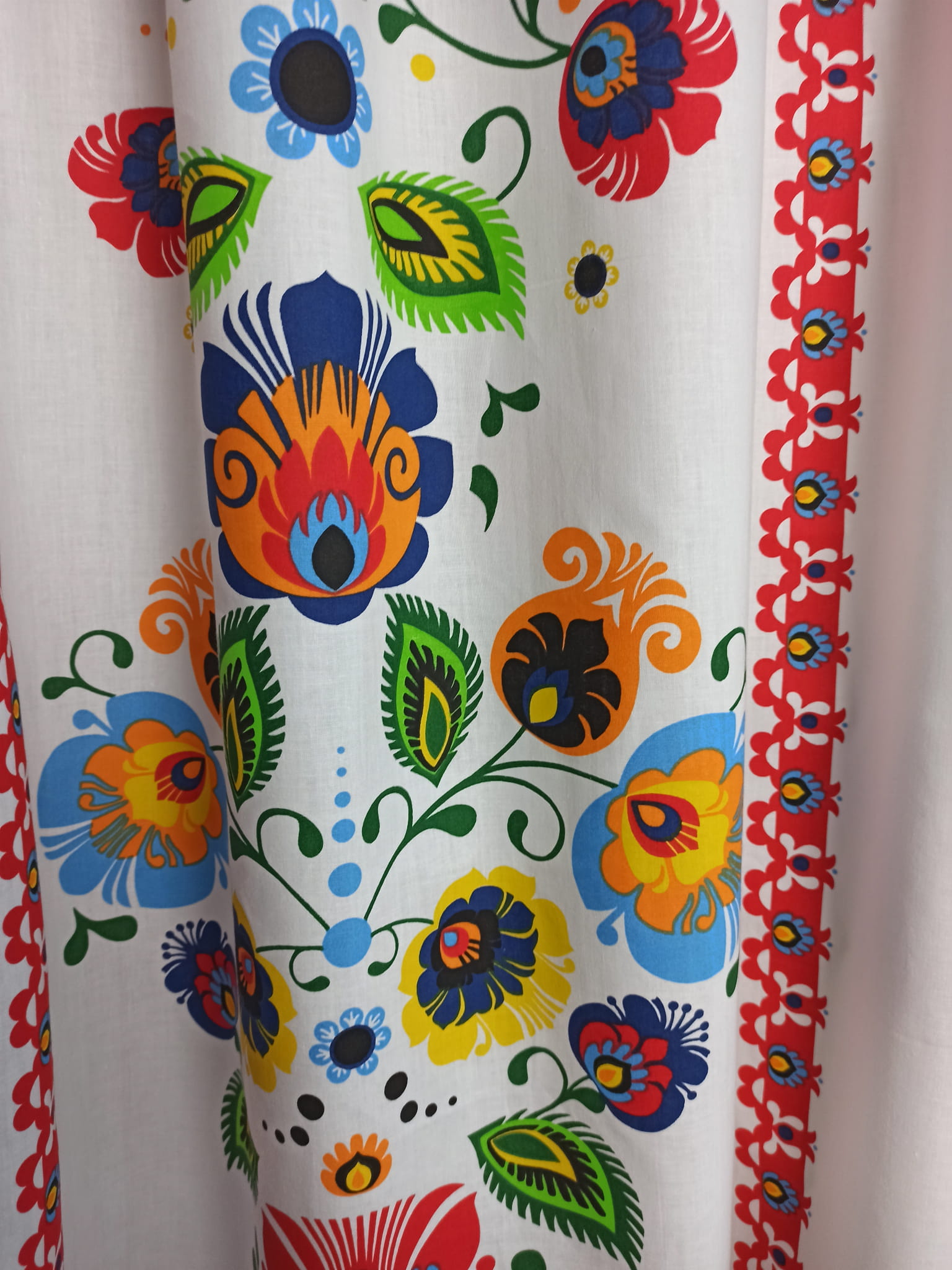 Oferuję uroczy komplet zasłon do kuchni w pięknych kolorach z wzorami folkowymi.