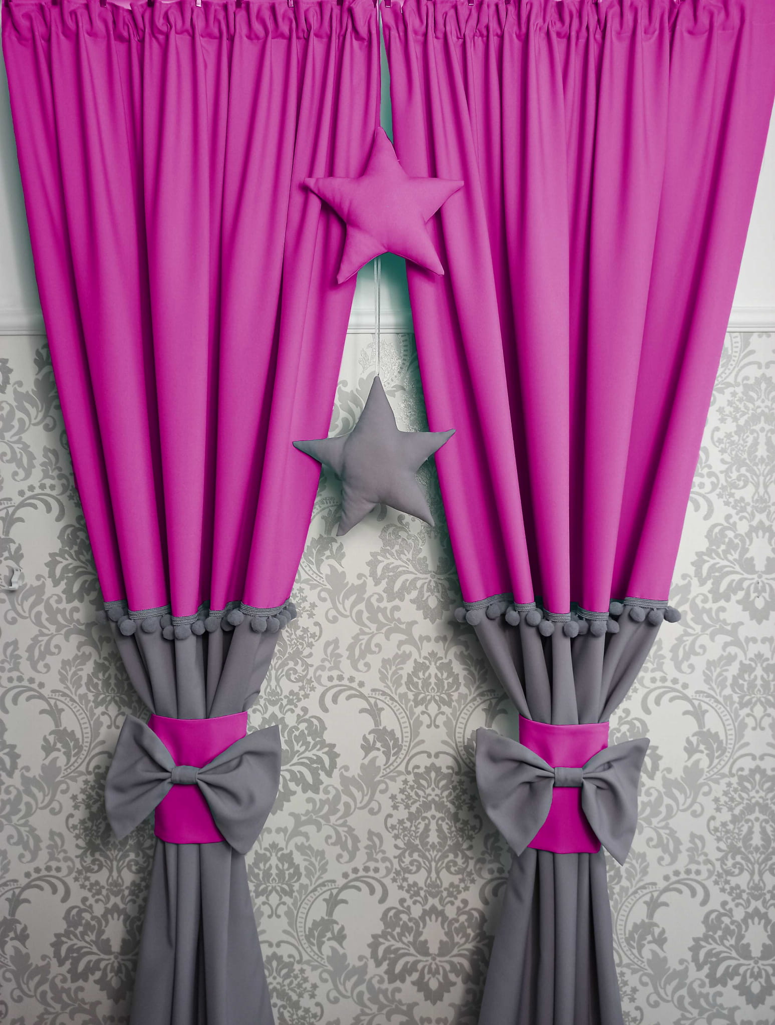 Oferuję uroczy komplet zasłon do pokoju dziecięcego w kolorach amarantu i szarości.
