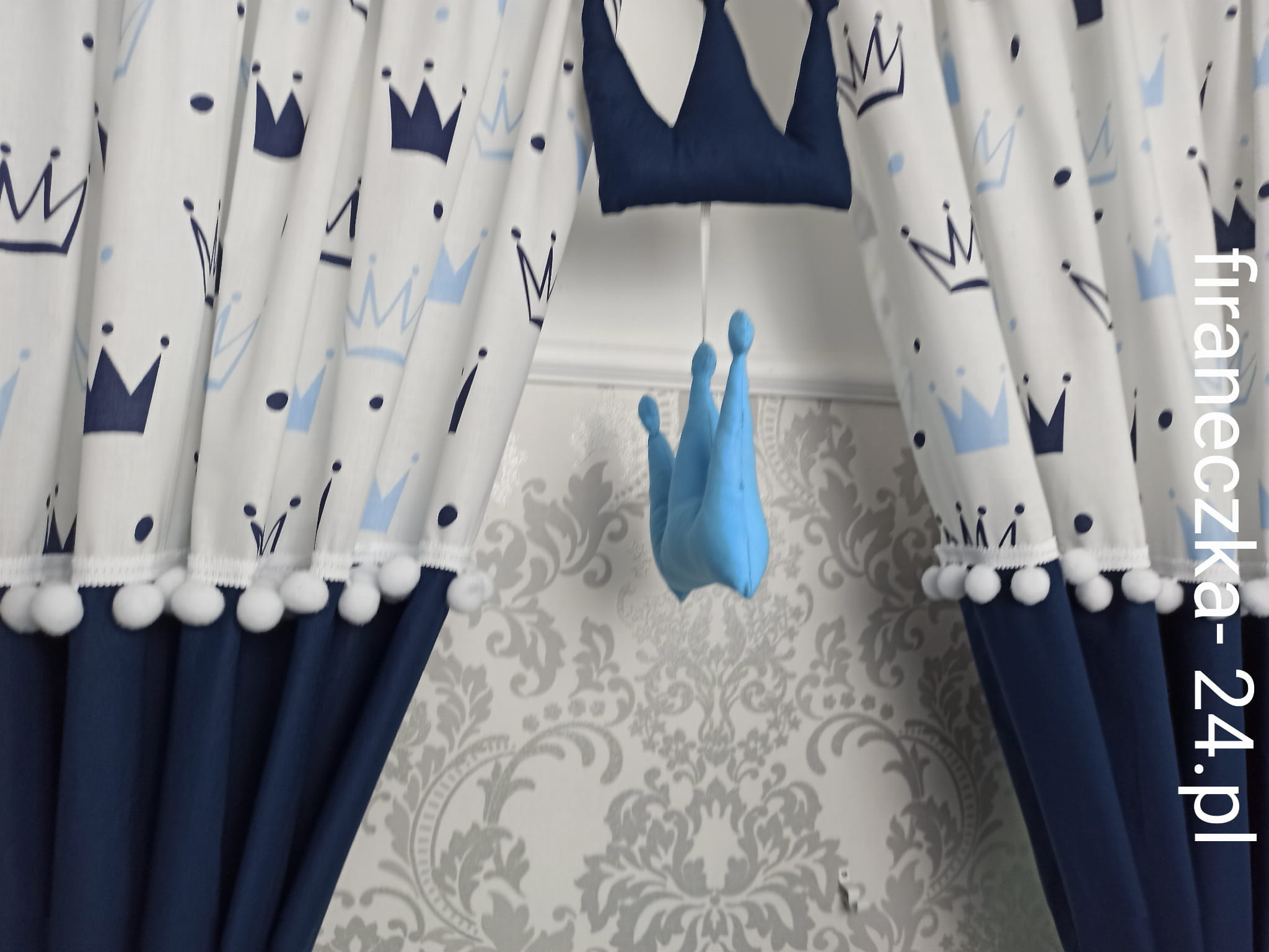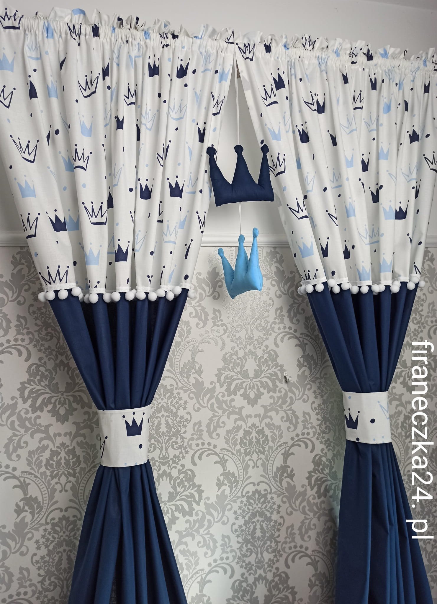 Oferuję uroczy komplet zasłon do pokoju dziecięcego w bialym i granatowym kolorze.