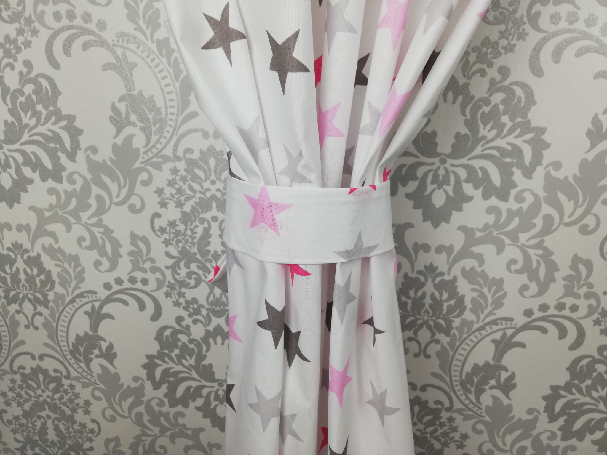 Oferuję uroczy komplet zasłon do pokoju dziecięcego w w szare i różowe gwiazdki.