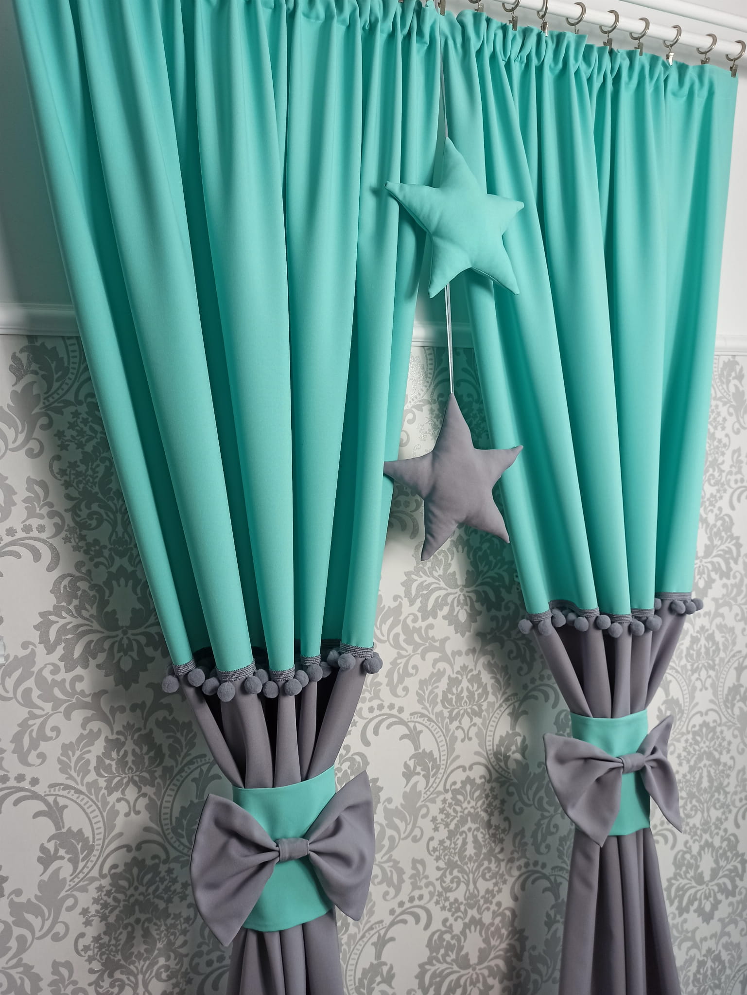 Oferuję uroczy komplet zasłon do pokoju dziecięcego w kolorach mięty i szarości.