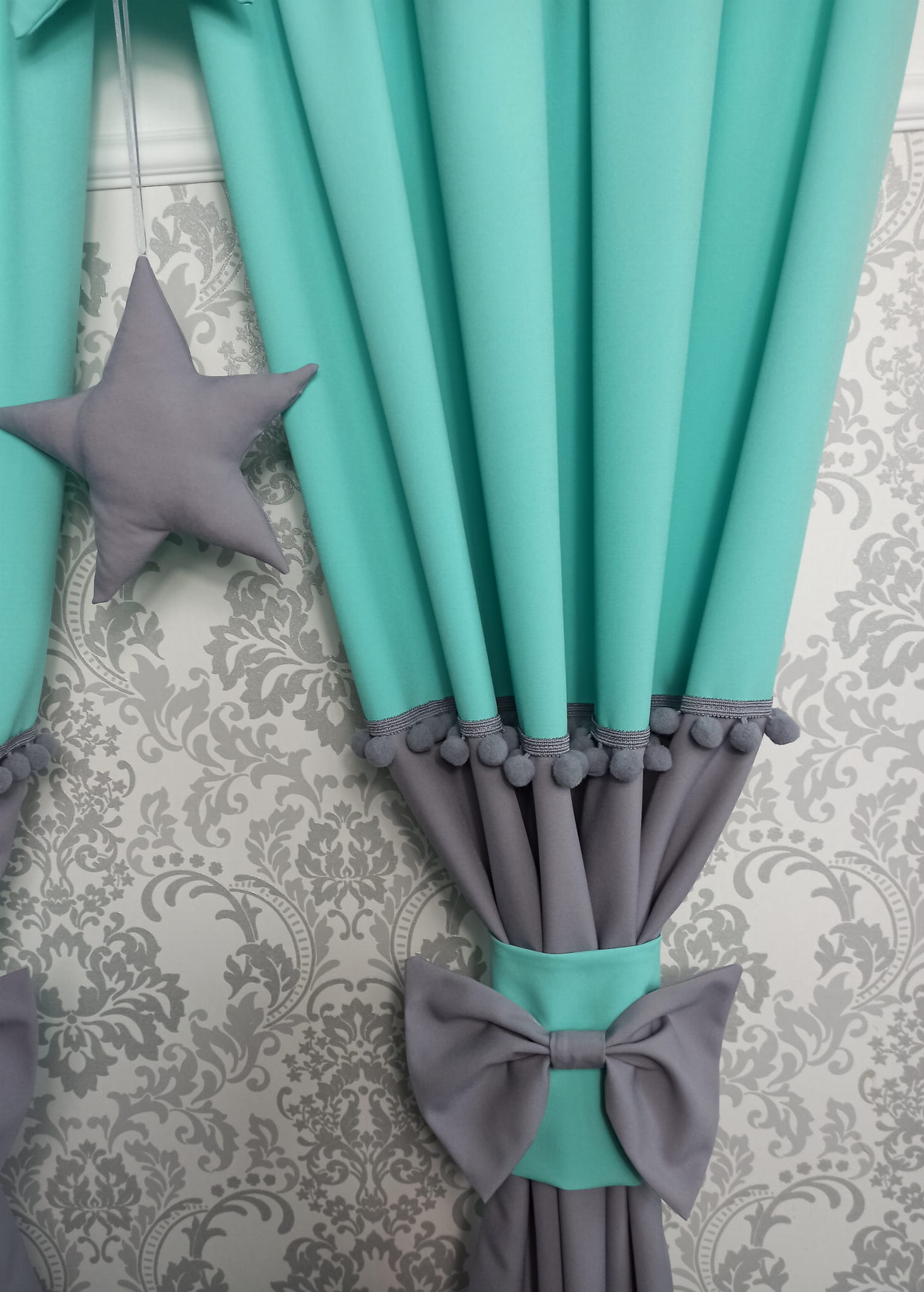 Komplet zasłon do pokoju dziecięcego miętowo szare pomponiki