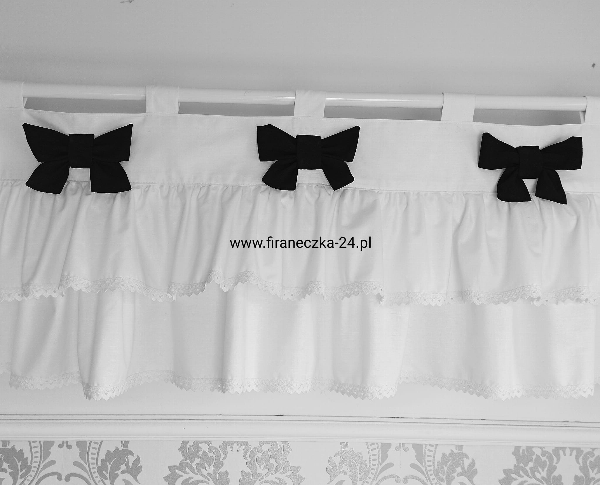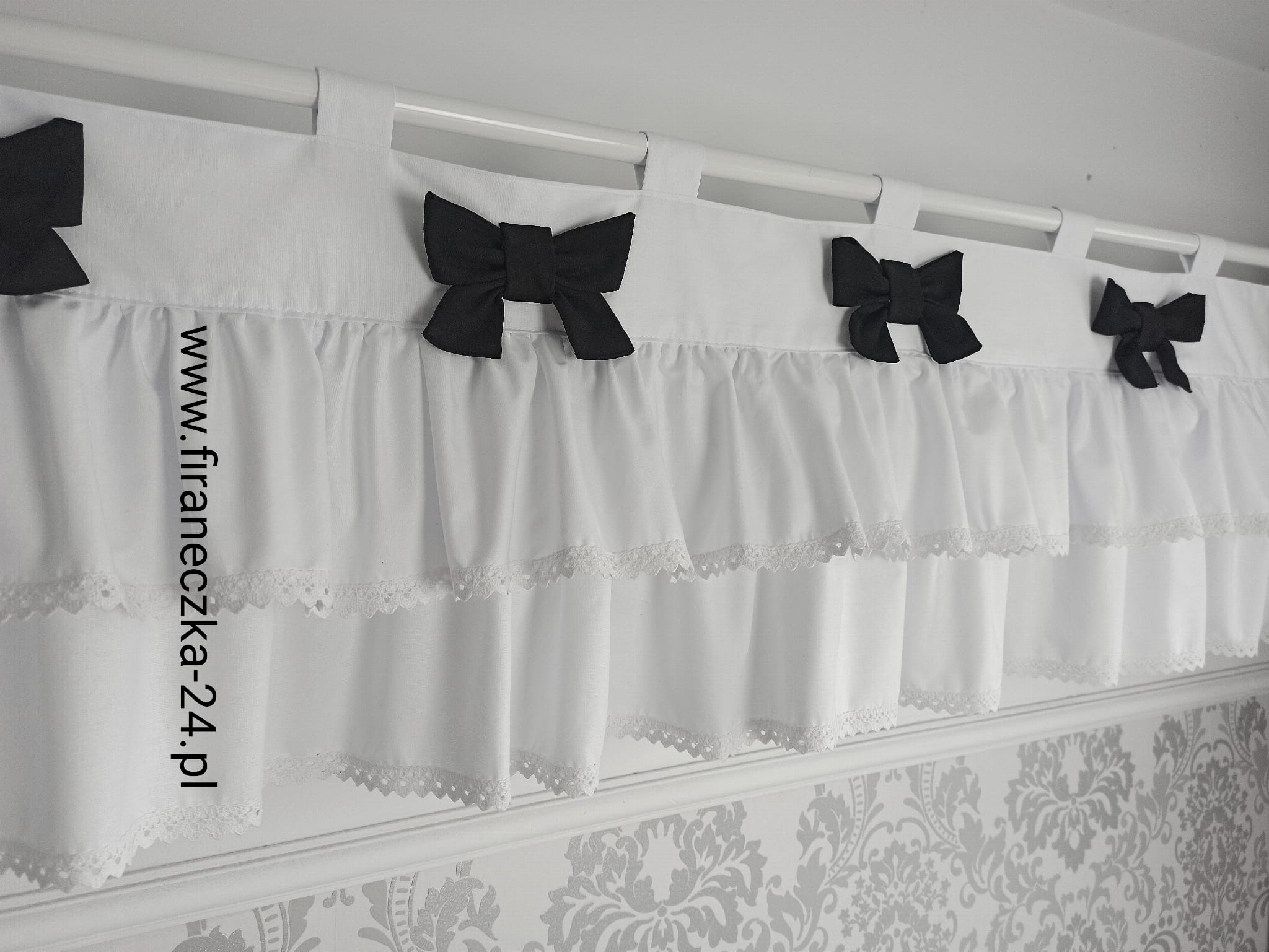 Lambrekin GOTOWY firanka biała szelki koronka bawełna kokardki czarne 160/30 WYSYŁK A 24H