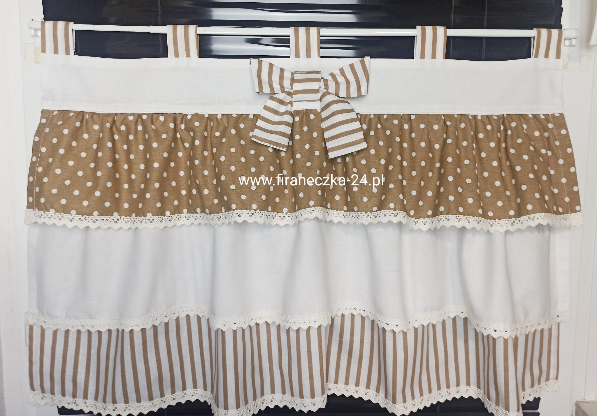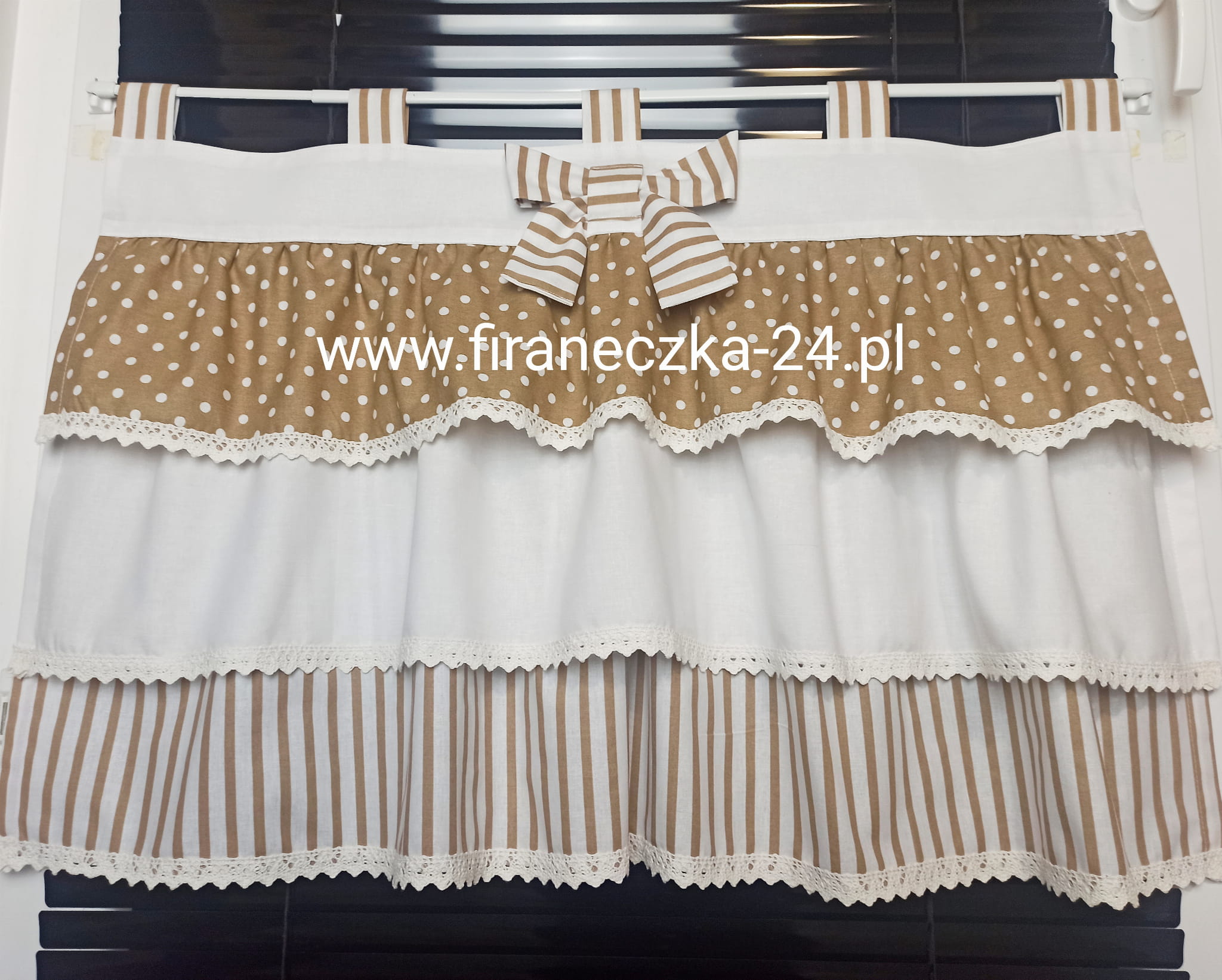 Oferuję GOTOWY lambrekin z białej i beżowej bawełny z kokardą.