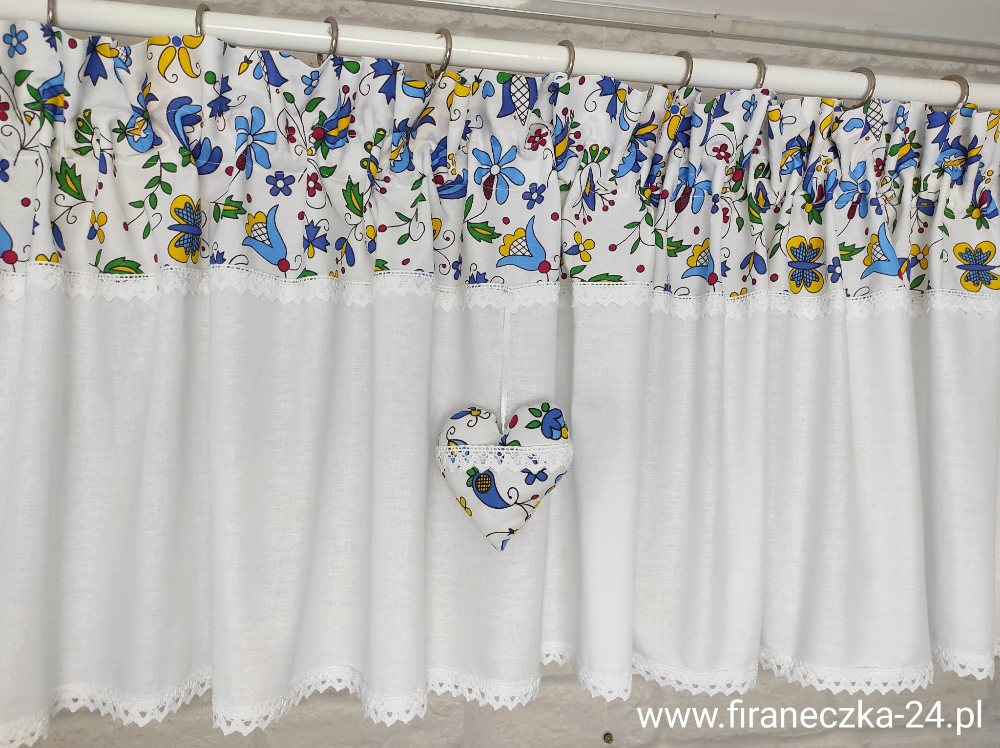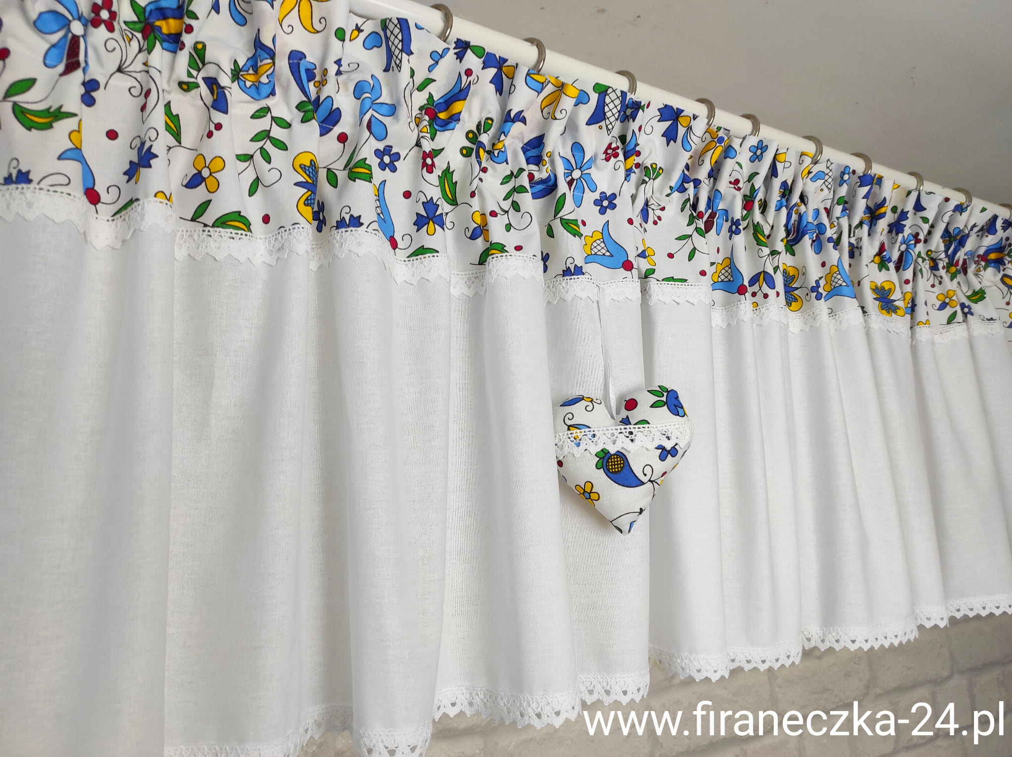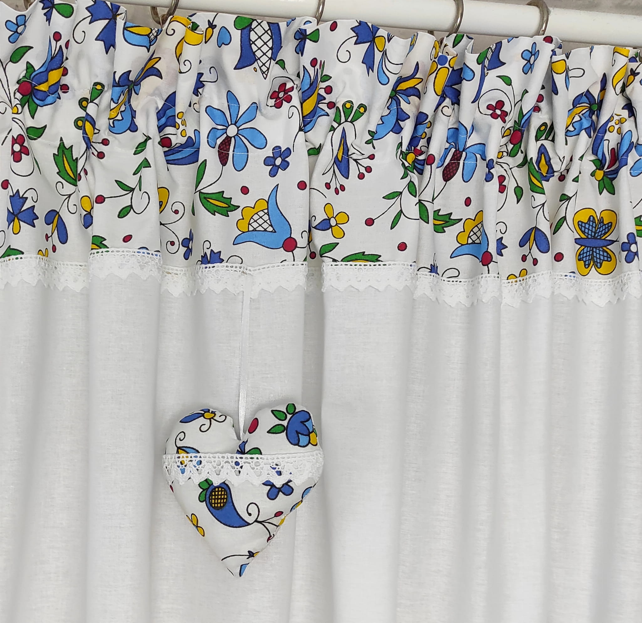 Oferuję piękny lambrekin w kaszubski wzór, ręcznie wykonany, piękny i niepowtarzalny. Lambrekin uszyty jest z polskiej bawełny z dodatkiem bawełnianej koronki. Na lambrekin przypadają 3 zawieszki z serduszkiem. Pięknie prezentuje się w romantycznym i nowoczesnym wnętrzu.