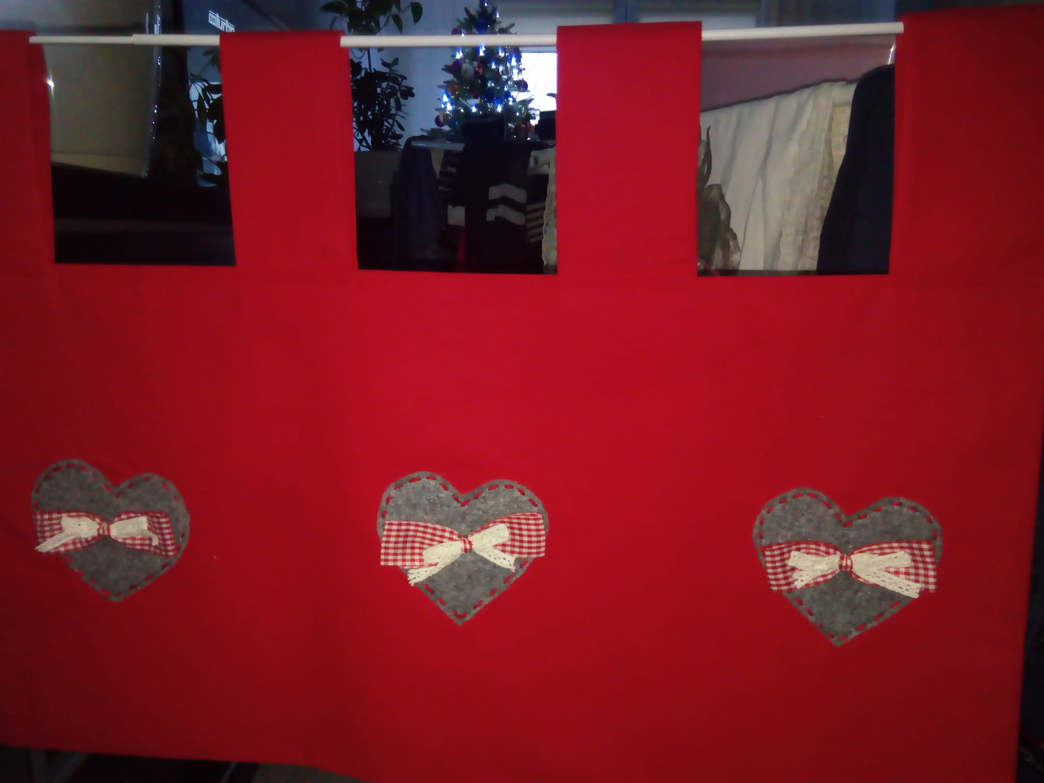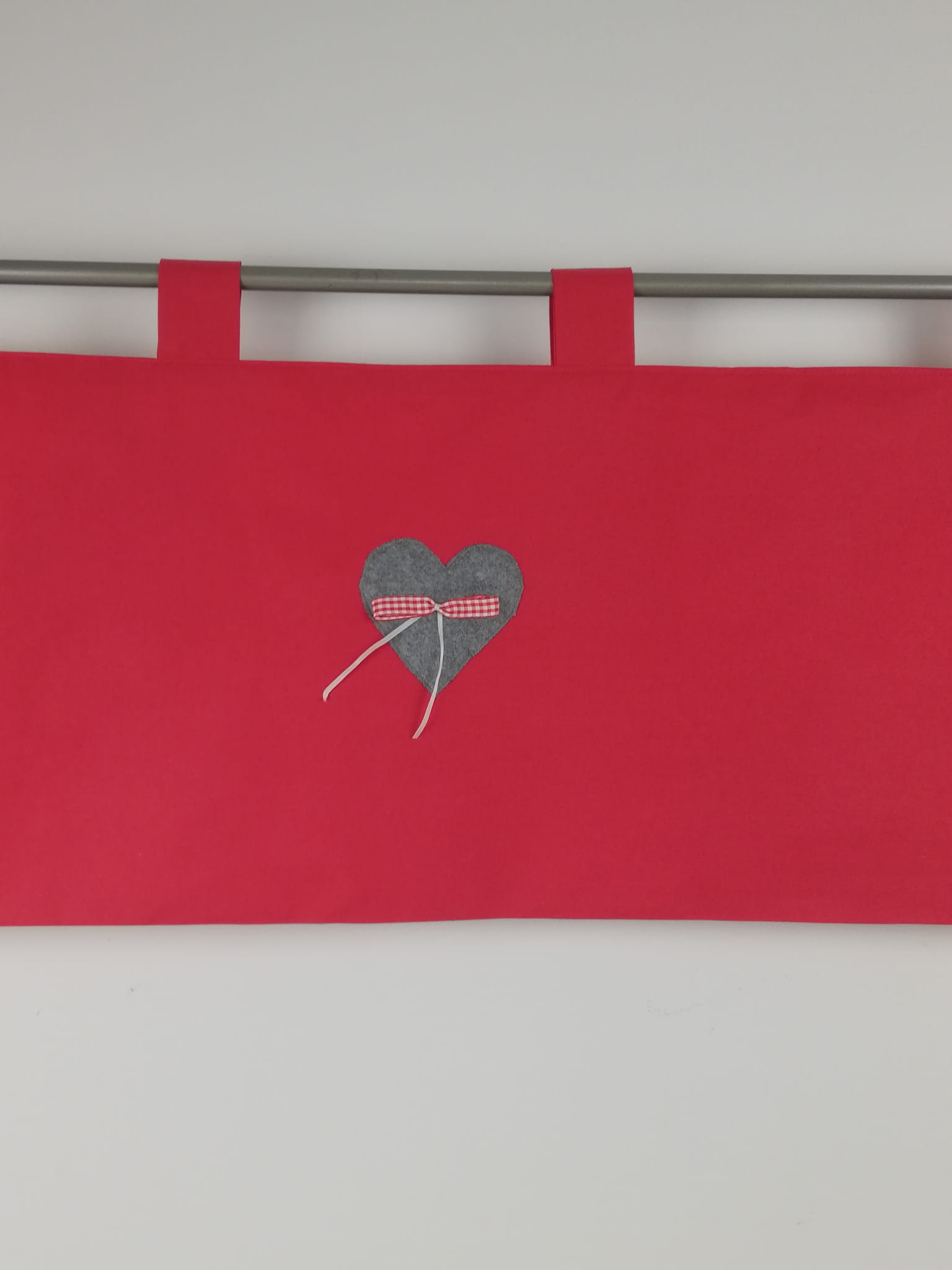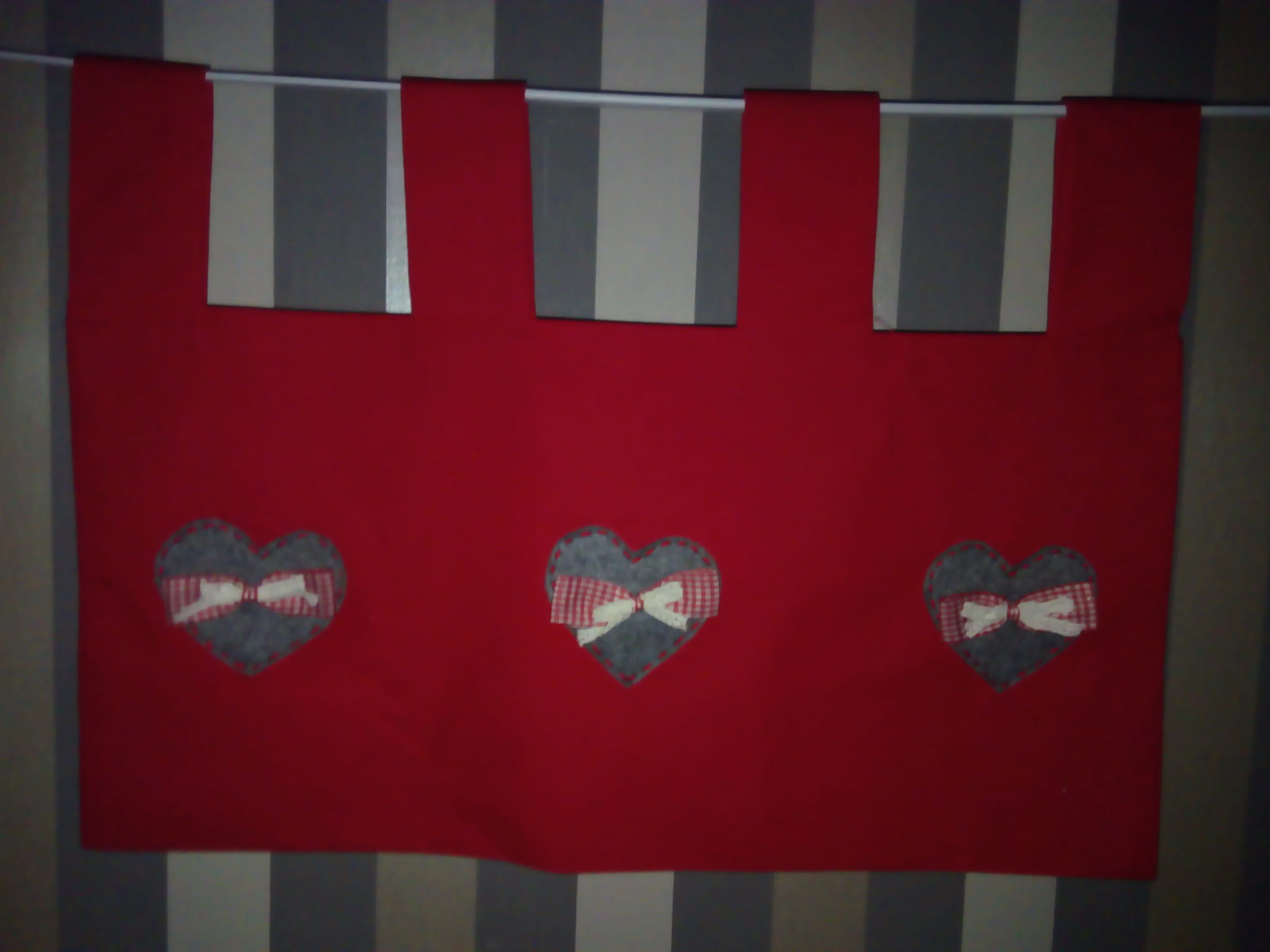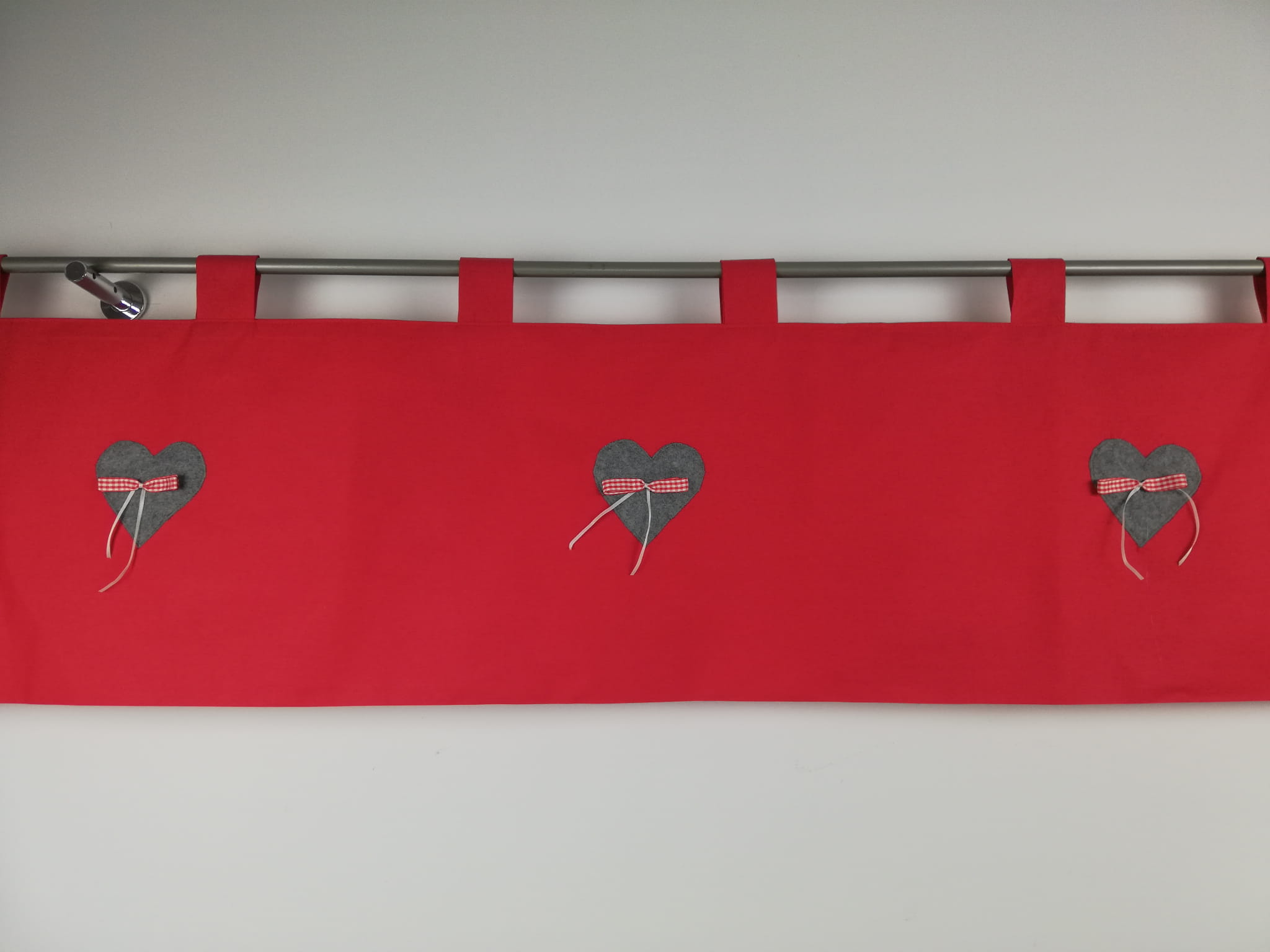Oferuję piękną zazdrostkę w kolorach czerwieni i szarości, ręcznie wykonaną, oryginalną i wyjątkową. Zazdrostka jest dwustronna, kolorowa bawełna przeszyta jest dwustronnie dzięki czemu wygląda tak samo również na zewnątrz.