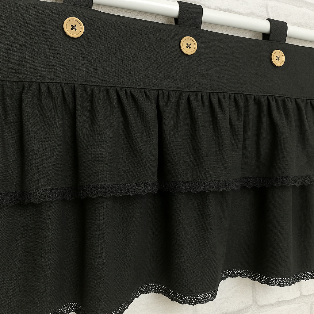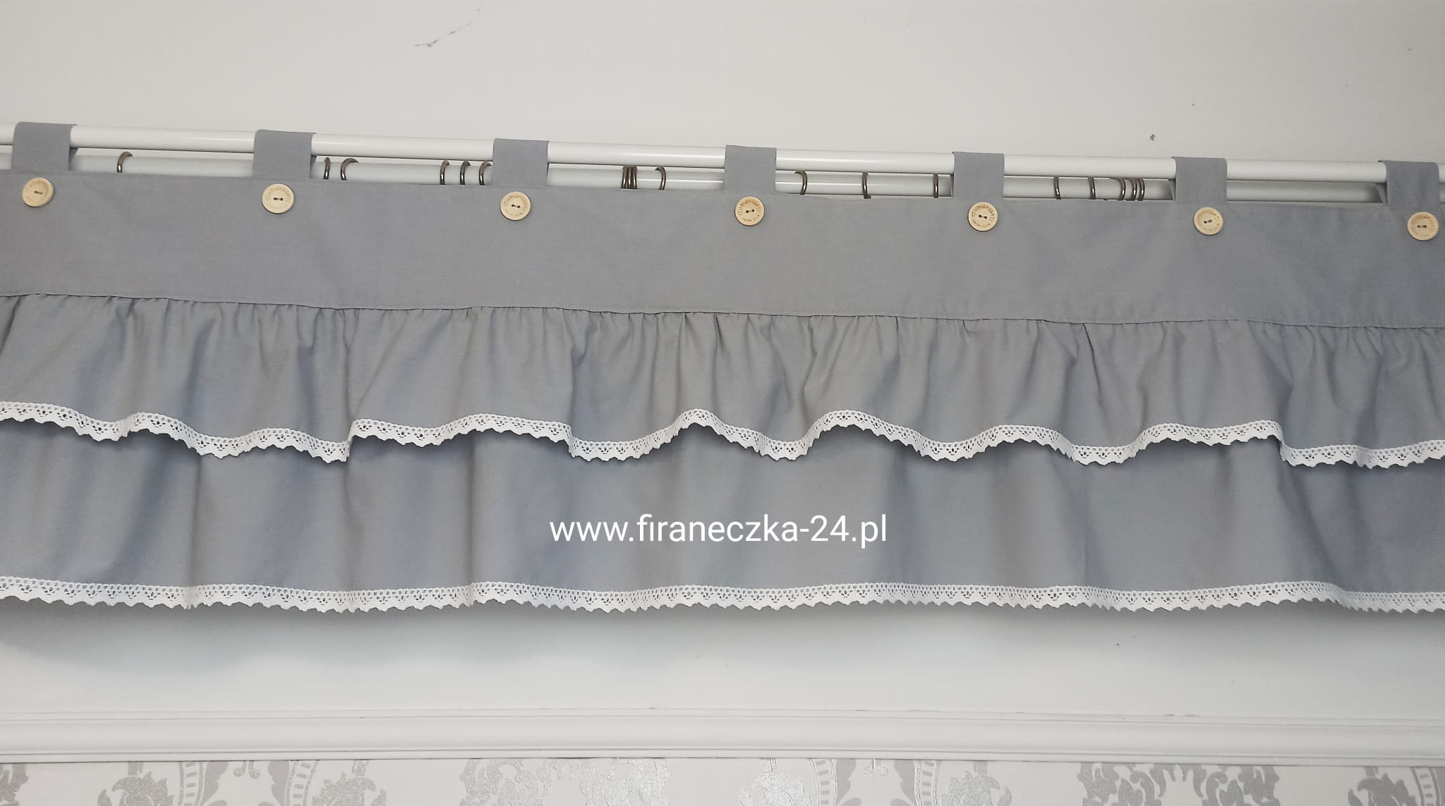 Lambrekin firanka szary szelki koronka bawełna guziczki KOLORY