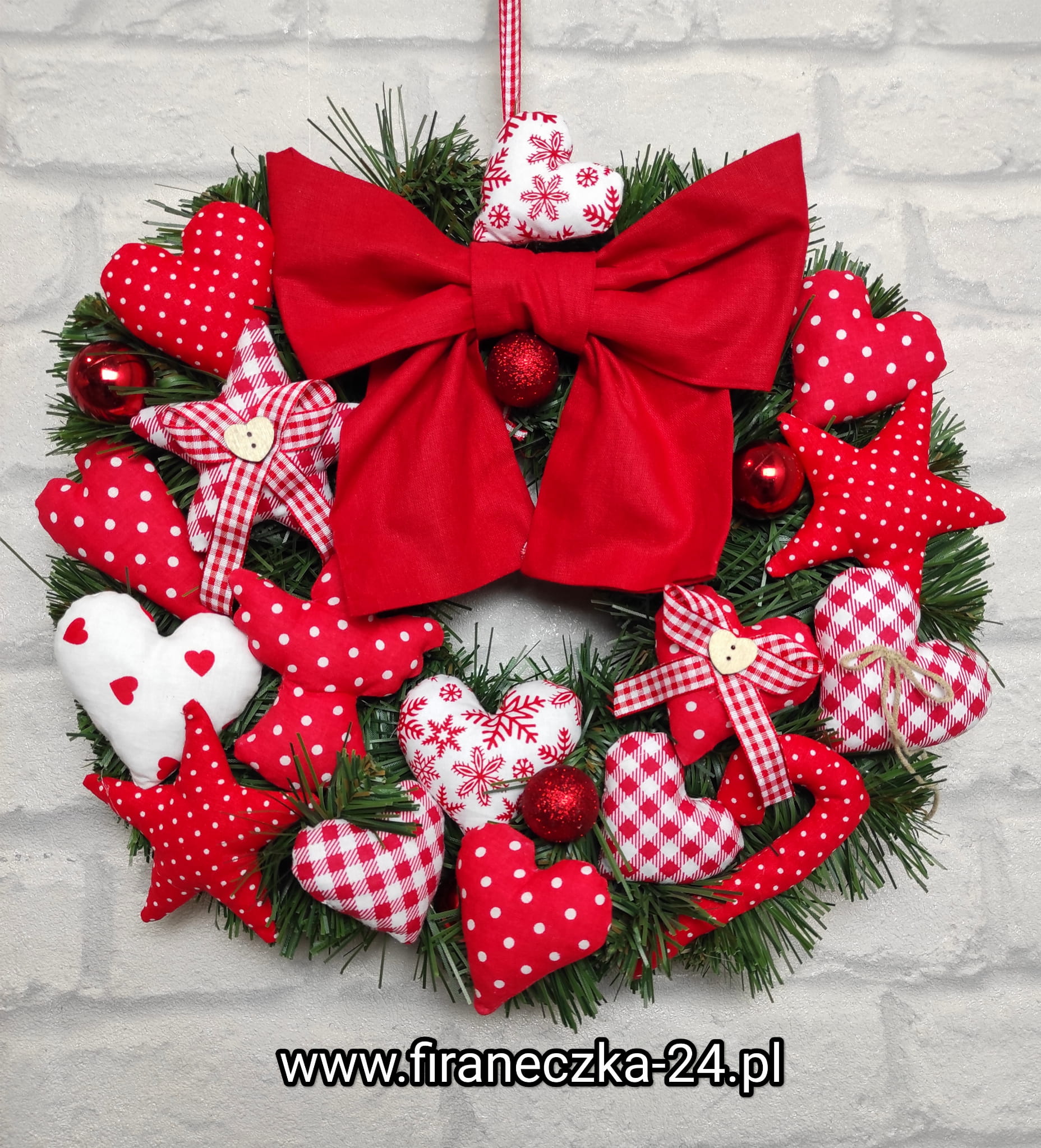 Wianek świąteczny z serduszkami i kokardą handmade bombki