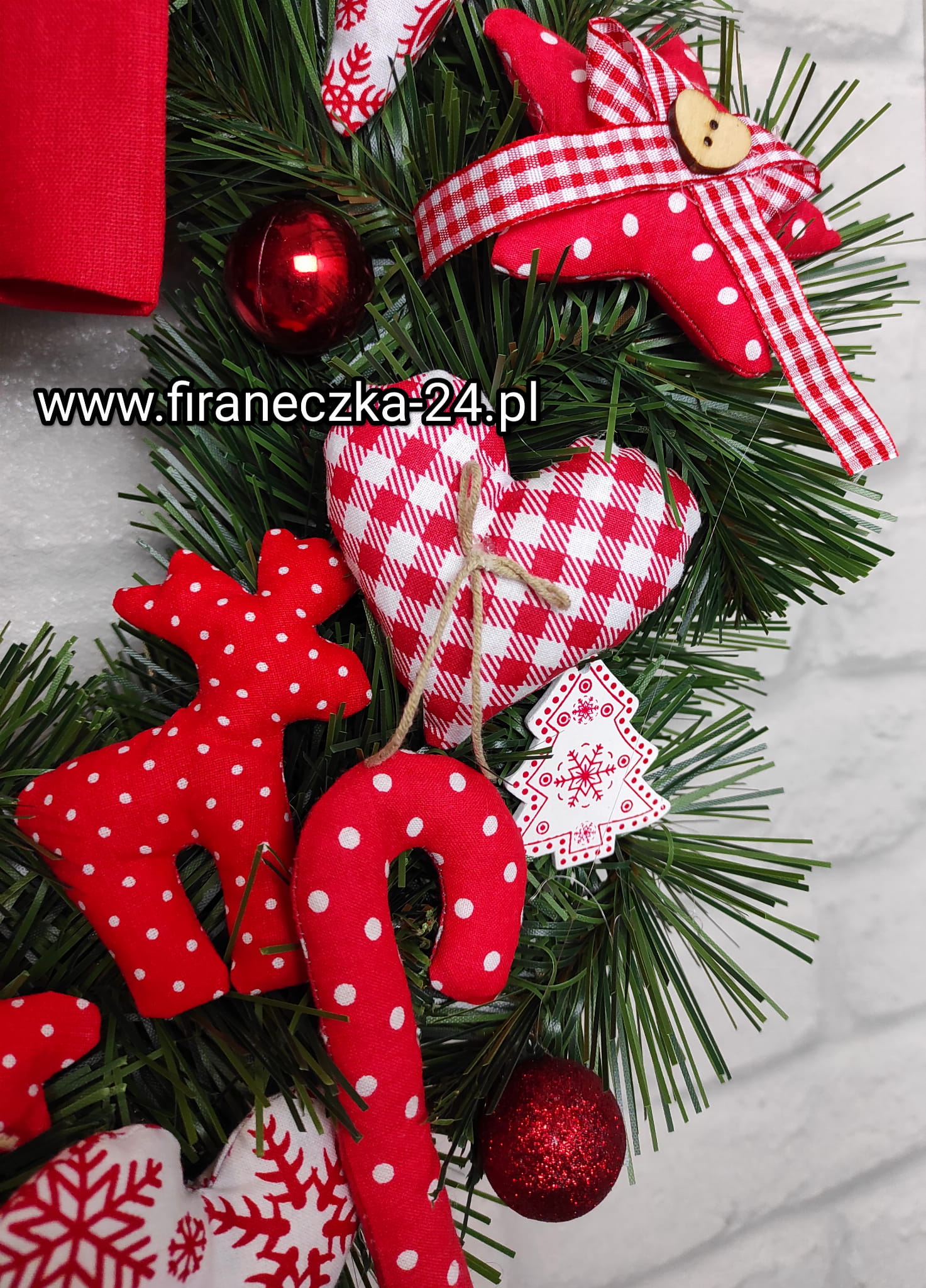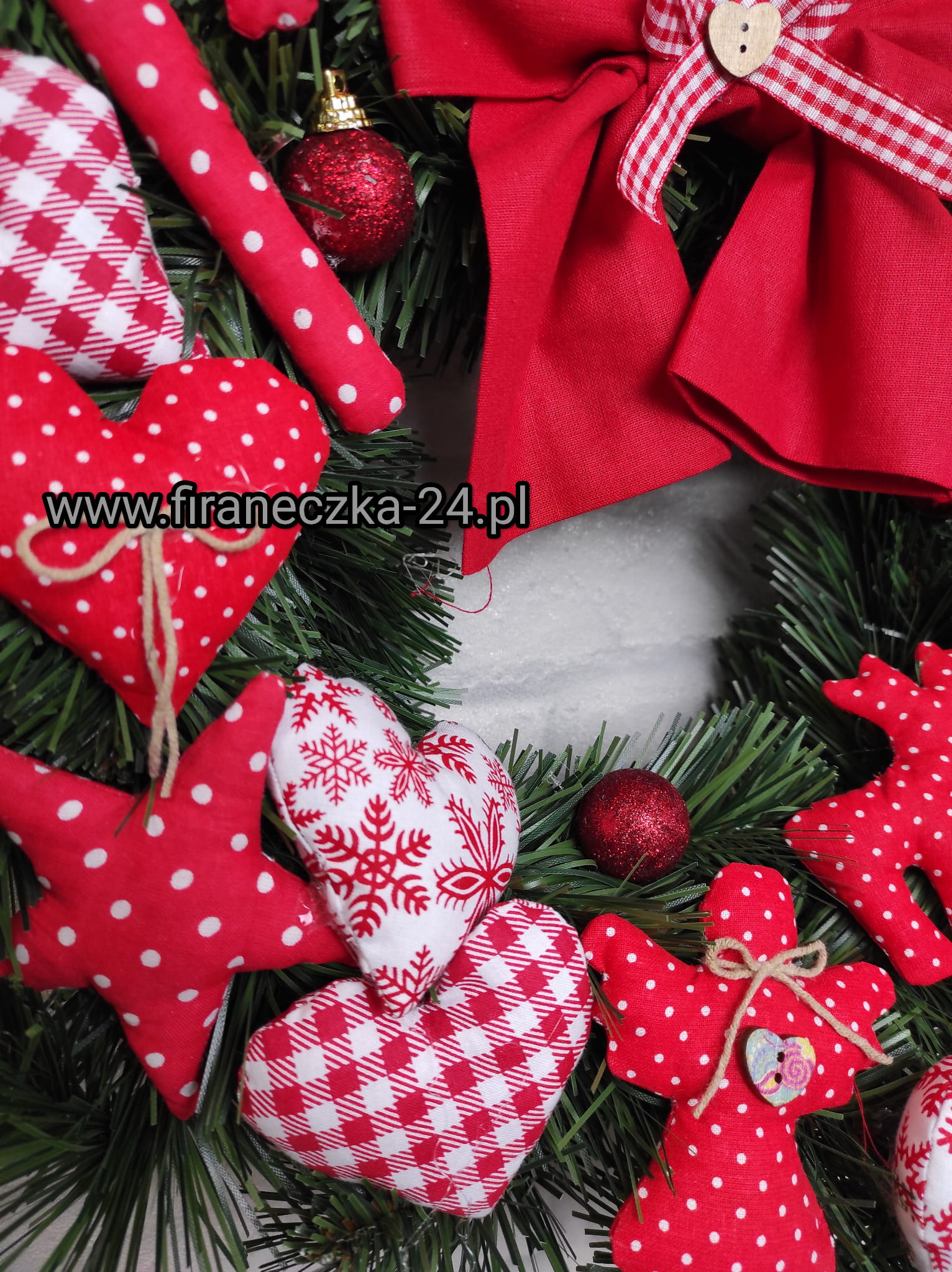 Wszystkie ozdoby zostały ręcznie wykonane, znajdują się tu serduszka, gwiazdki czy aniołek, dzięki temu wianek jest jedyny i niepowtarzalny.