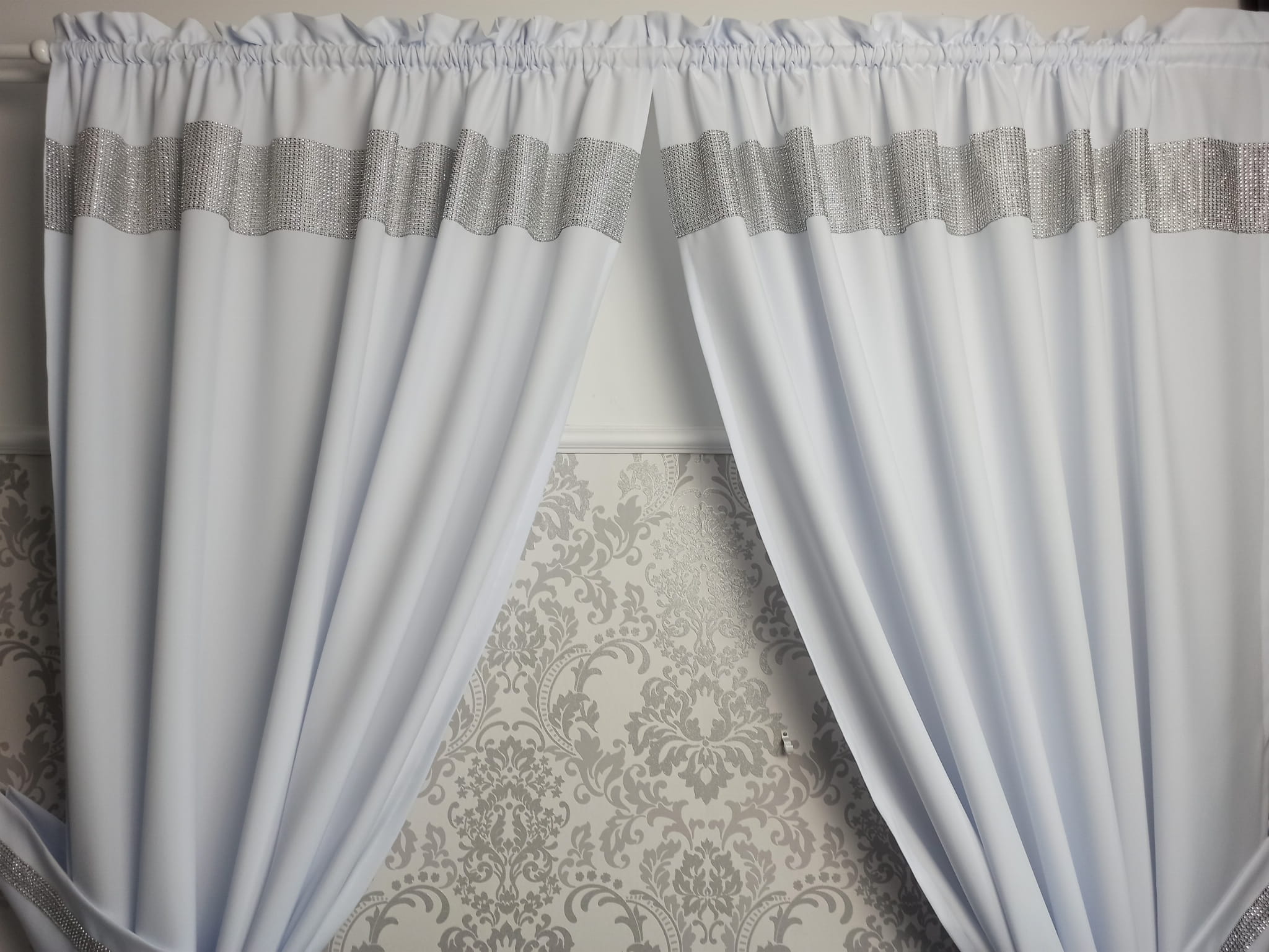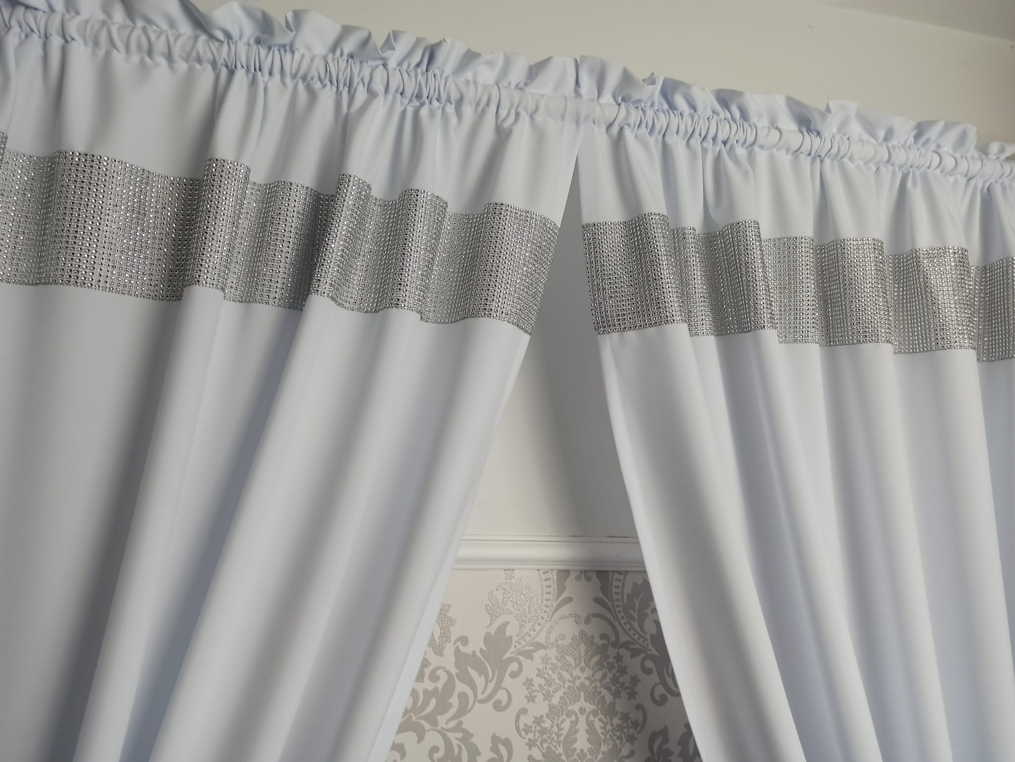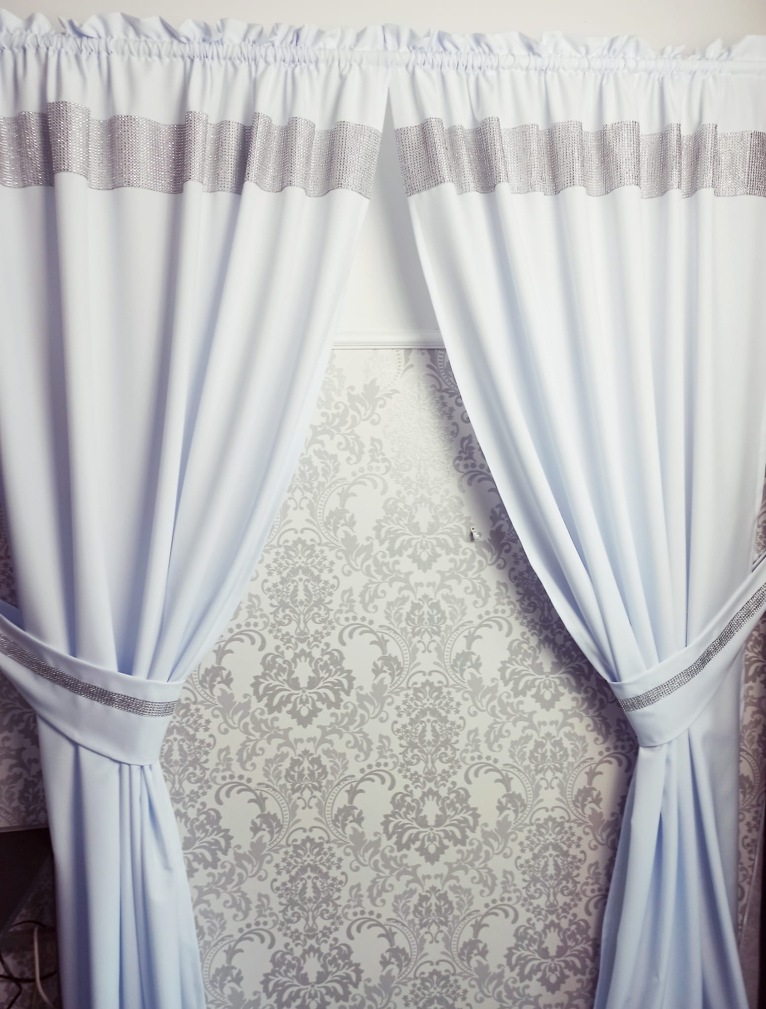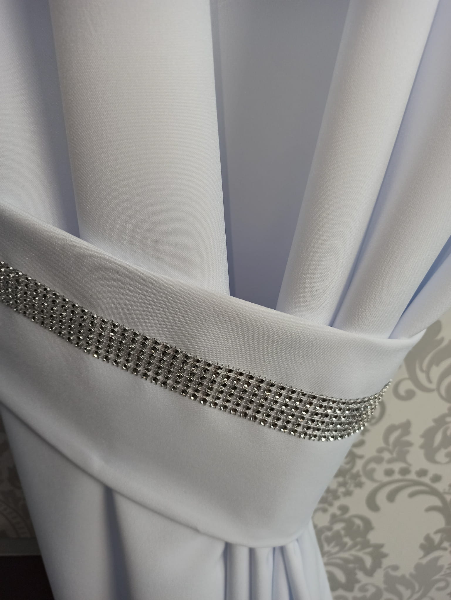 Gotowe do powieszenia zasłony z pasem cyrkonii i podwiązkami zbierających zasłony.
