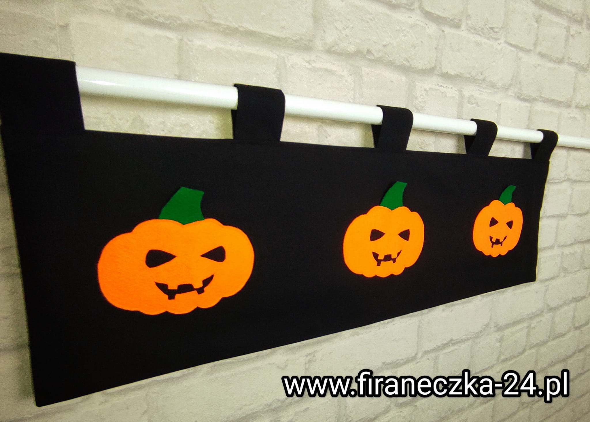 Zazdrostka uszyta z polskiej bawełny z dodatkiem filcowych, ręcznie uszytych dyń. Wyjątkowa,l dekoracja, która ociepli, nie tylko kuchenne okno w okresie Halloween.