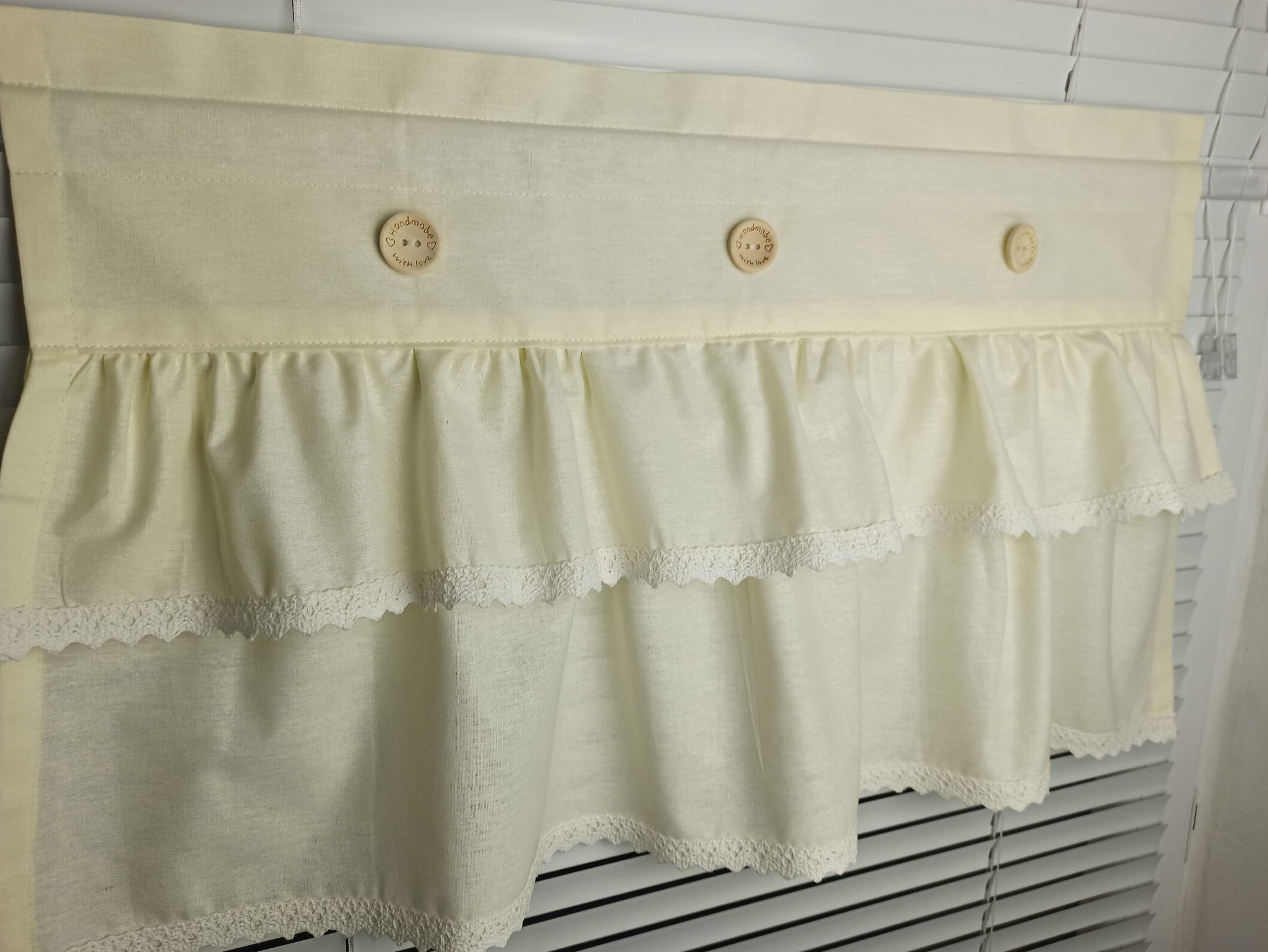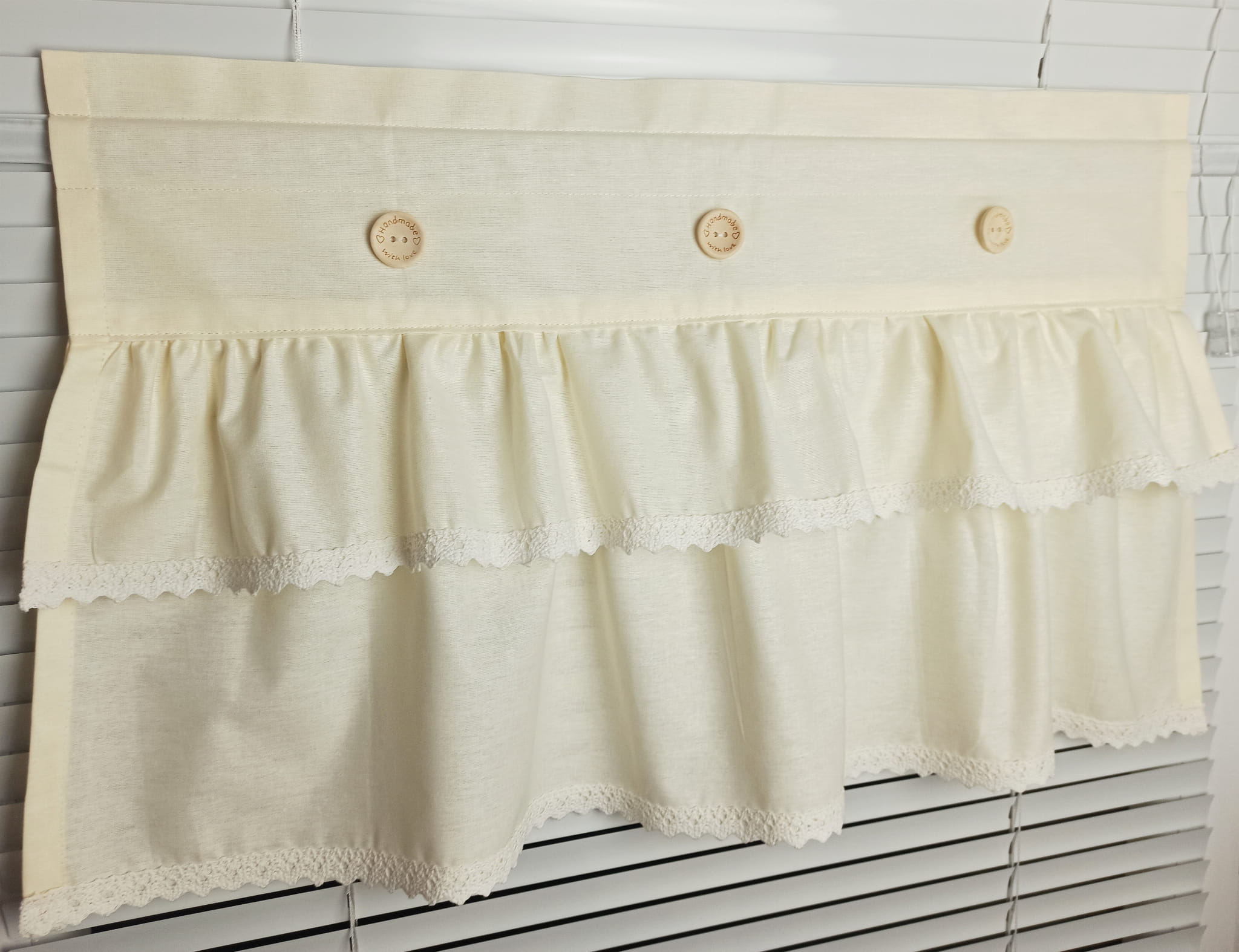 Zazdrostka uszyta z polskiej bawełny z dodatkiem bawełnianej koronki. Na zazdrostkę przyszyte beżowe guziczki.