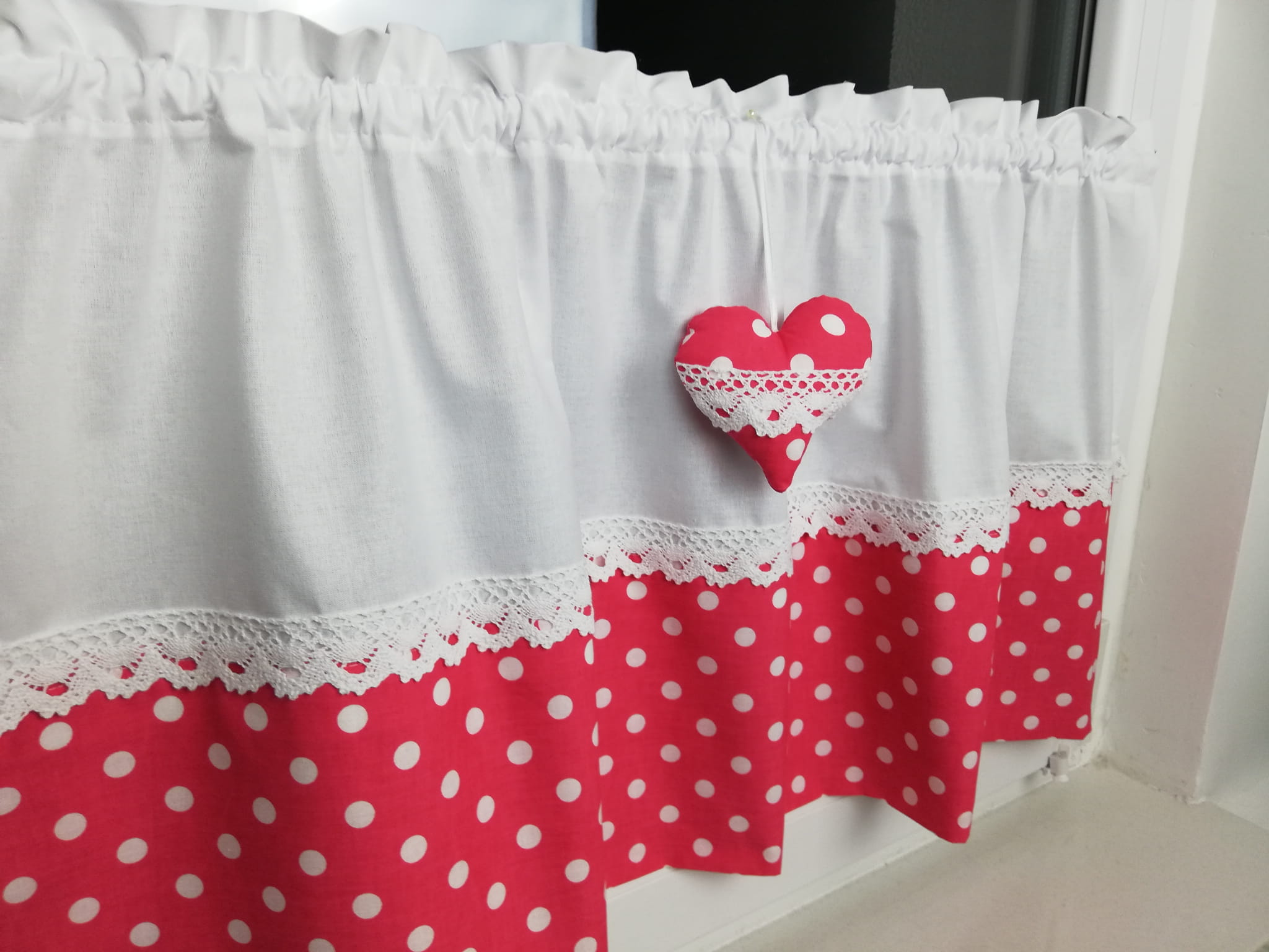 Zazdrostka uszyta z polskiej bawełny z dodatkiem bawełnianej koronki. Na zazdrostkę przypada 1 zawieszka z serduszkiem. Pięknie prezentuje się w romantycznym i nowoczesnym wnętrzu.