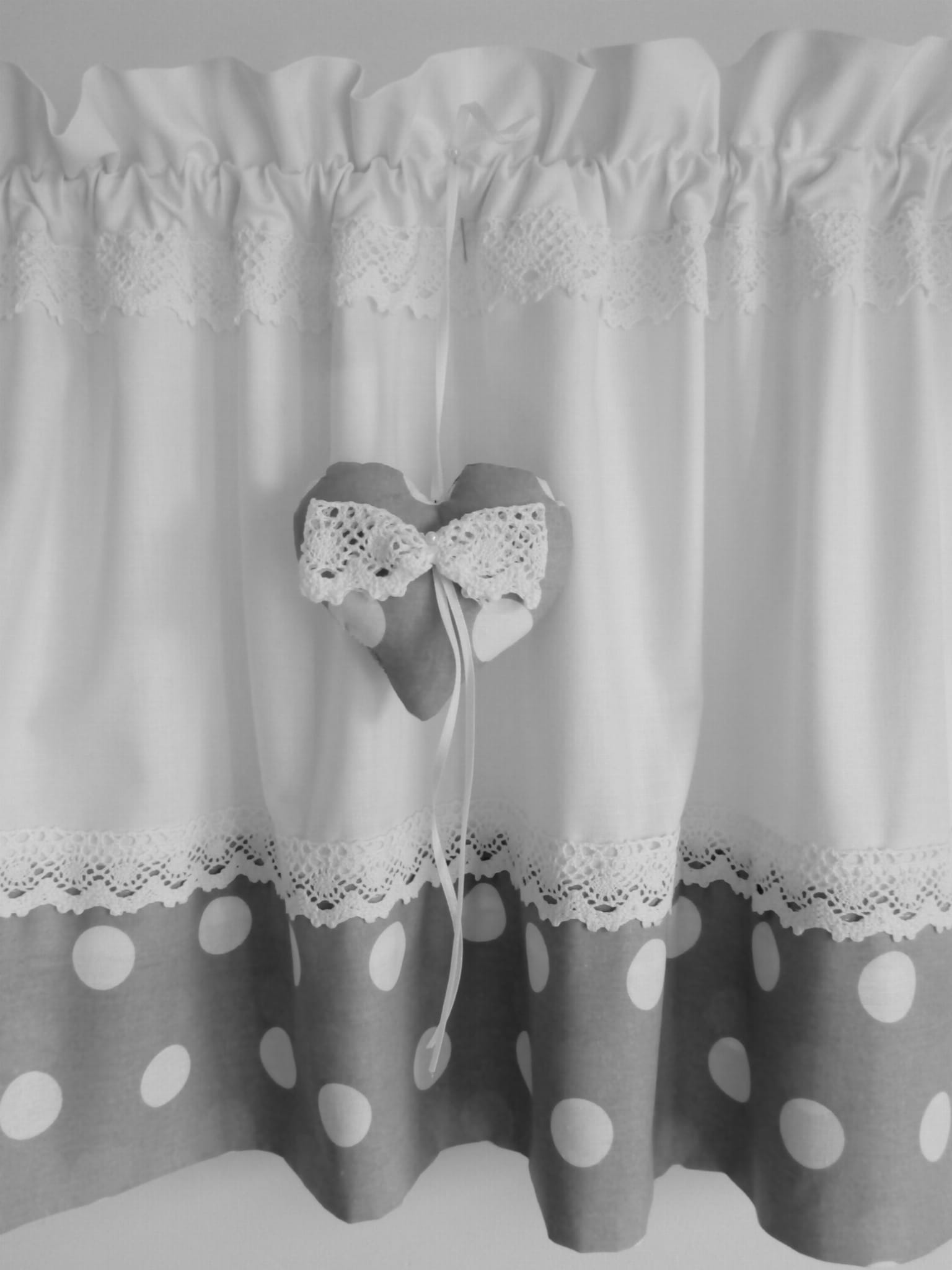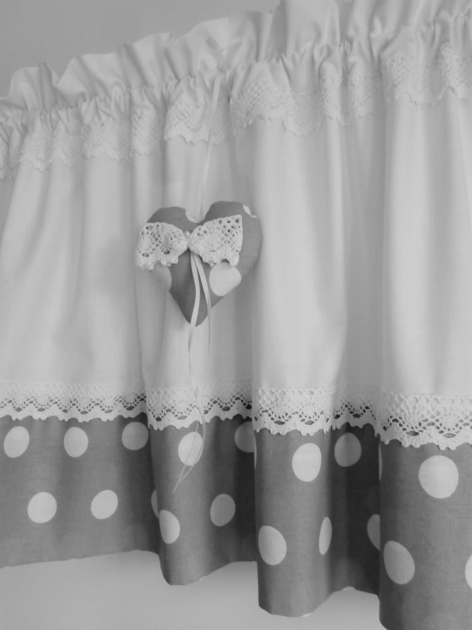 Zazdrostka uszyta z polskiej bawełny z dodatkiem bawełnianej koronki. Na zazdrostkę przypada 1 zawieszka z serduszkiem. Pięknie prezentuje się w romantycznym i nowoczesnym wnętrzu.