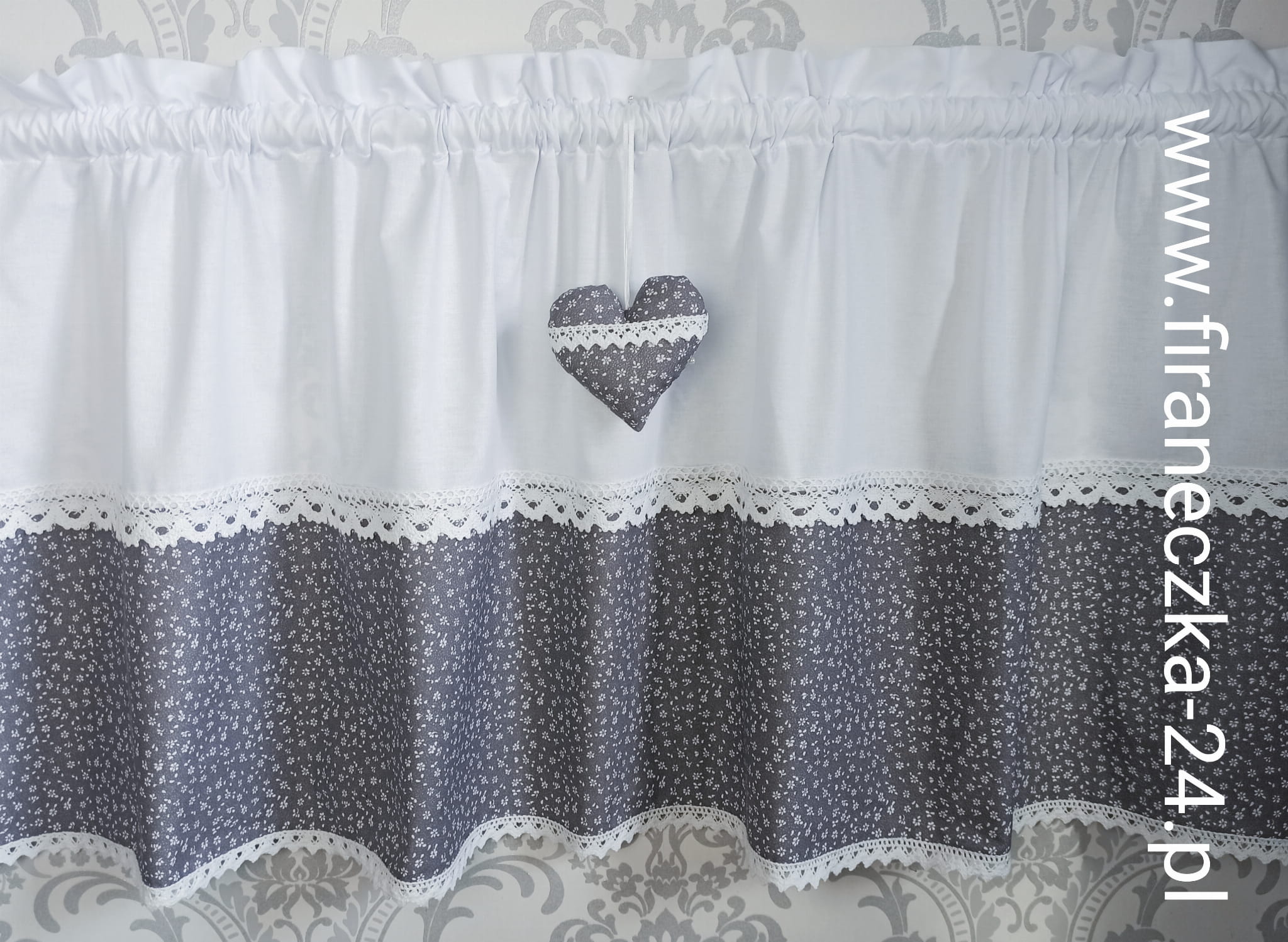 Zazdrostka uszyta z polskiej bawełny z dodatkiem bawełnianej koronki. Na zazdrostkę przypada 1 zawieszka z serduszkiem. Pięknie prezentuje się w każdym wnętrzu.