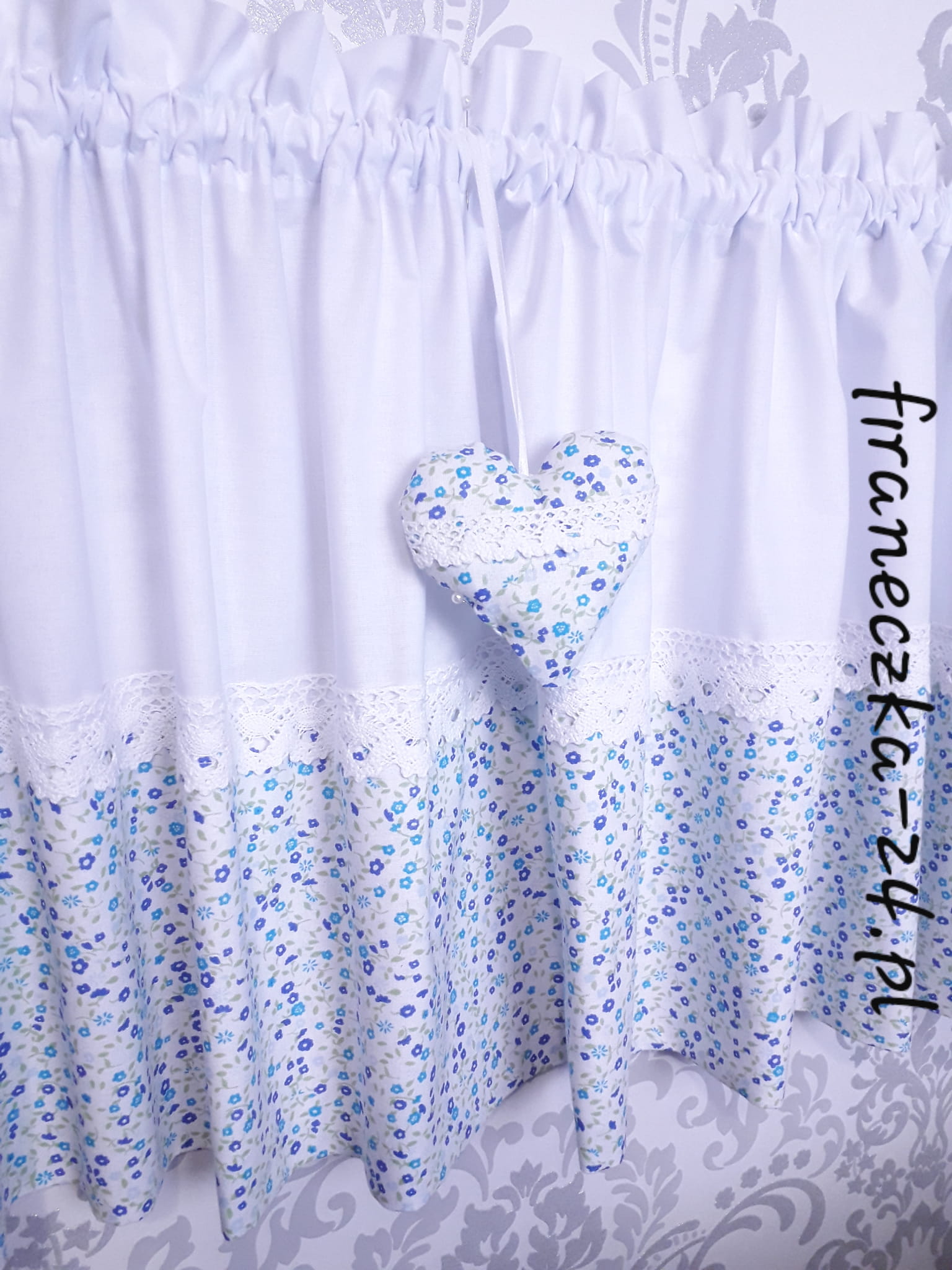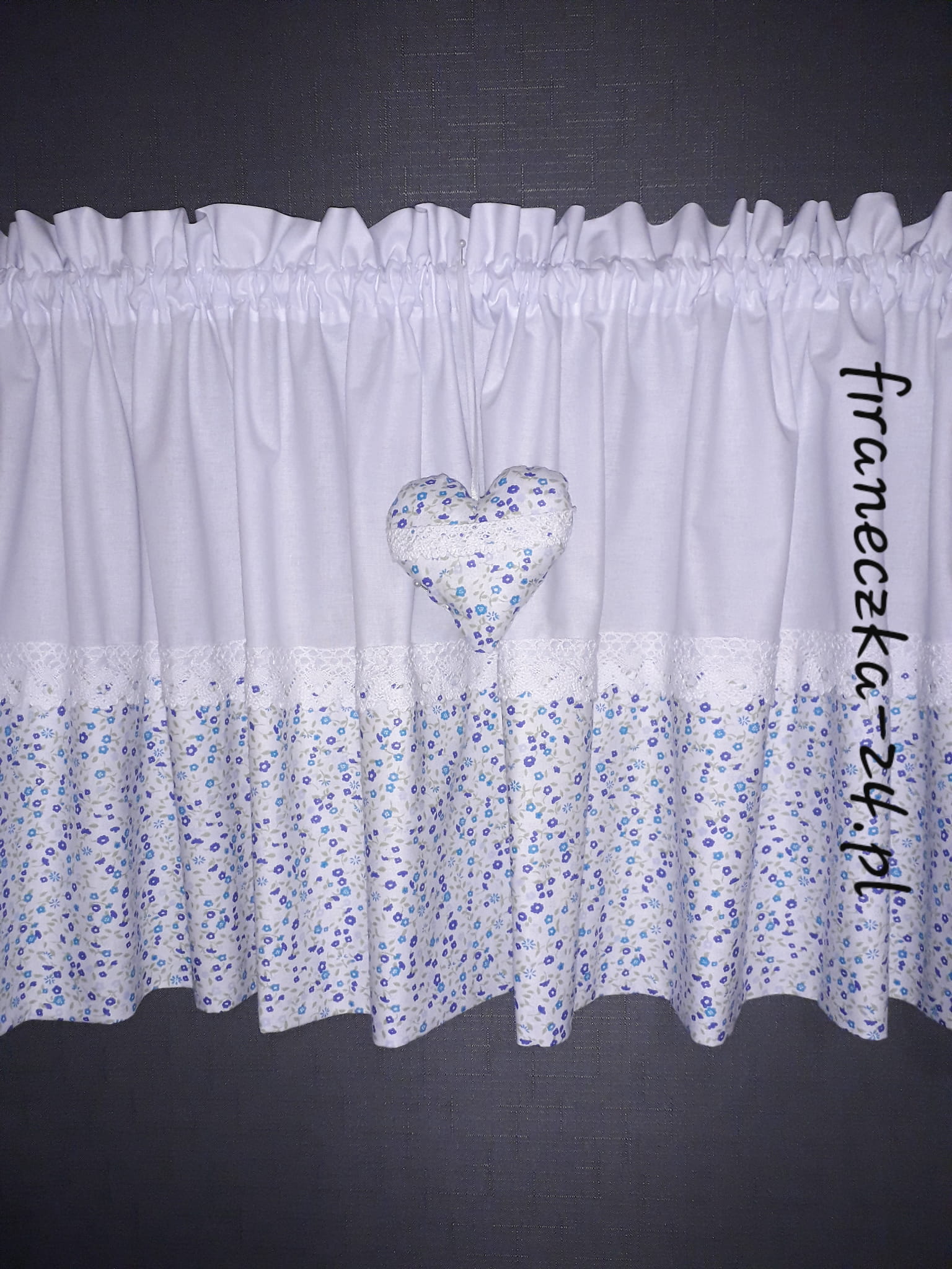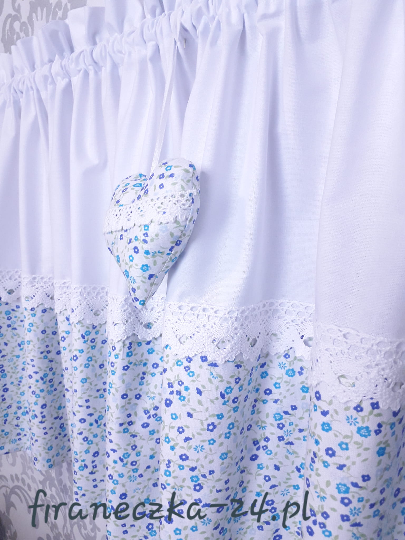 Zazdrostka uszyta z polskiej bawełny z dodatkiem bawełnianej koronki. Na zazdrostkę przypada 1 zawieszka z serduszkiem.